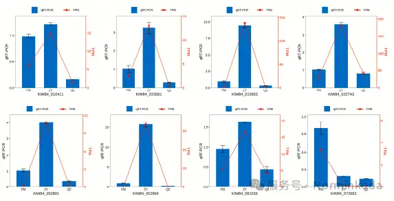随机挑选8个候选基因进行qRT-PCR验证,其结果与转录组(RNA-seq)数据高度一致(R² = 0.8441),证明了测序数据的可靠性。