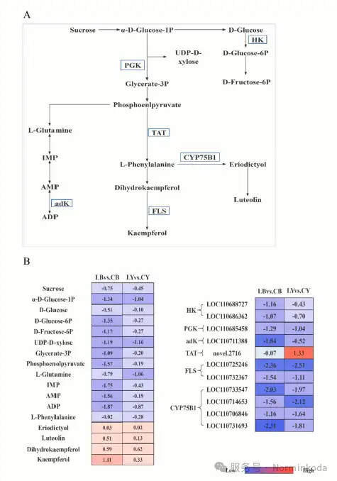 5.联合分析: 通过整合代谢组和转录组数据,构建了藜麦花穗响应低磷和高磷胁迫的核心代谢通路图,并识别了关键基因与代谢物的关联关系。例如,低磷下糖酵解和淀粉蔗糖代谢相关基因(如HK, PGK)表达下调,导致葡萄糖、蔗糖等能量物质减少;高磷下有机酸代谢和三羧酸循环中间产物(如琥珀酸、GABA)含量发生变化。