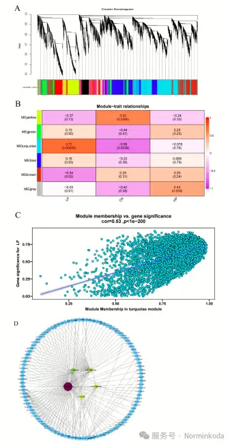6.WGCNA分析: 通过加权基因共表达网络分析,发现一个与低磷胁迫高度正相关的模块(turquoise module),并从中筛选出5个核心基因(LOC110682232, LOC110682806, LOC110682954, LOC110684542, novel.780)。