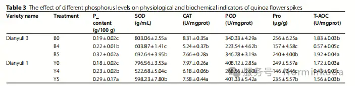 2.农艺与生理指标: 研究发现适量磷(450 kg/hm²)促进藜麦生长,而缺磷或磷过量均抑制生长(如株高、茎粗、生物量降低)。生理指标显示,低磷和高磷胁迫均会诱导抗氧化酶(SOD, POD, CAT)活性、脯氨酸(Pro)和总抗氧化能力(T-AOC)的变化,以应对胁迫。