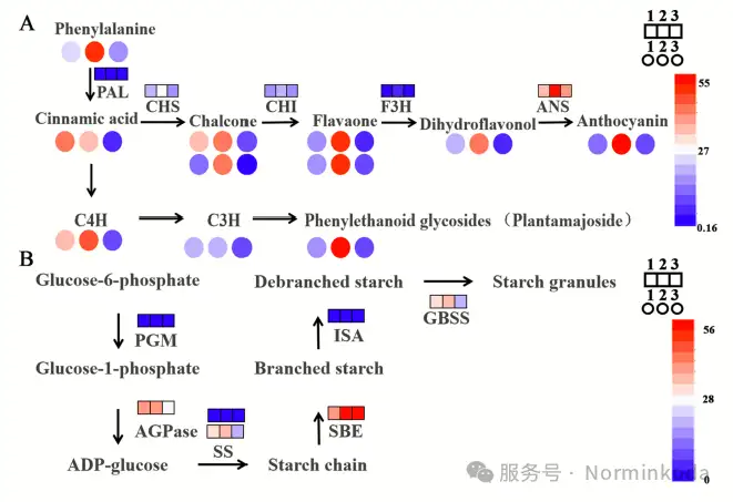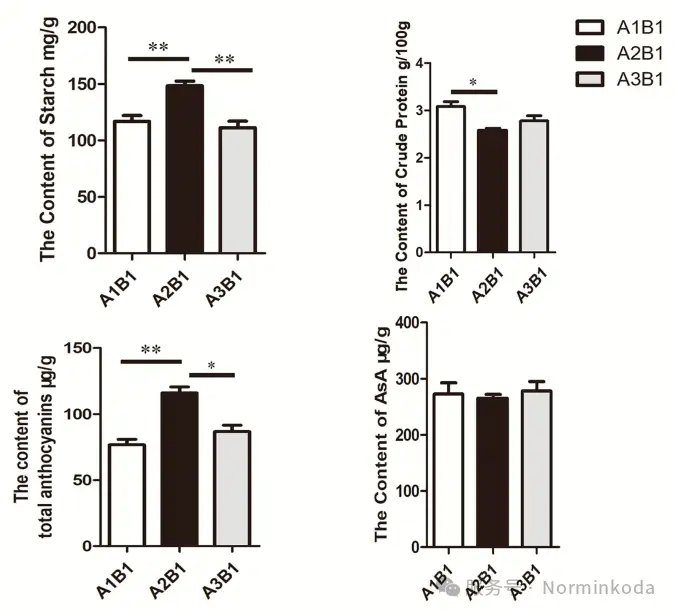 6.多组学整合分析: 研究重点整合了与花青素和淀粉合成相关的通路。结果显示,在A2B1条件下,花青素合成通路中的关键基因DFR, ANS, UFGT表达量显著上调;同时,淀粉合成通路中的SS, SBE, GBSS等基因也显著高表达。这与代谢组中黄酮类物质积累和表型中淀粉、花青素含量增加的结果高度一致。