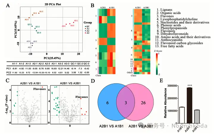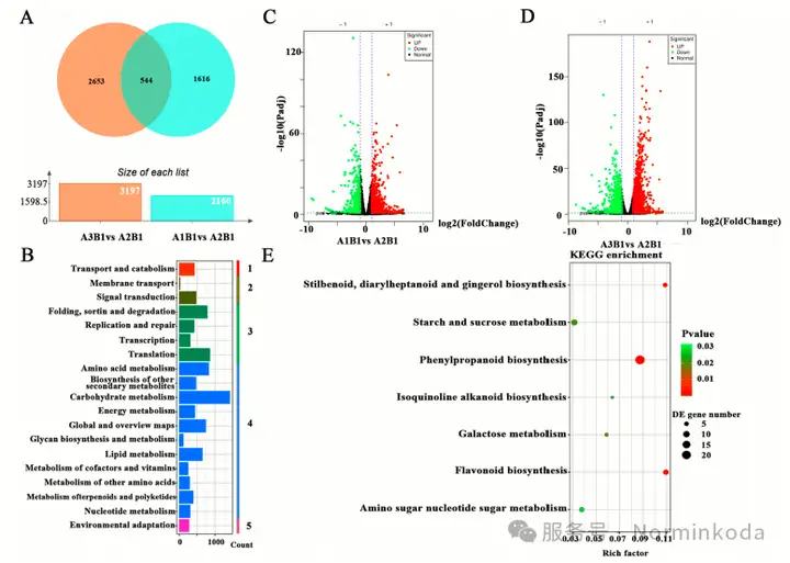 5.转录组学分析: 转录组分析在A2B1 vs. 其他处理的比较中鉴定出大量差异表达基因。KEGG富集分析表明,这些基因显著富集于“黄酮类生物合成”以及“淀粉和蔗糖代谢”等通路。