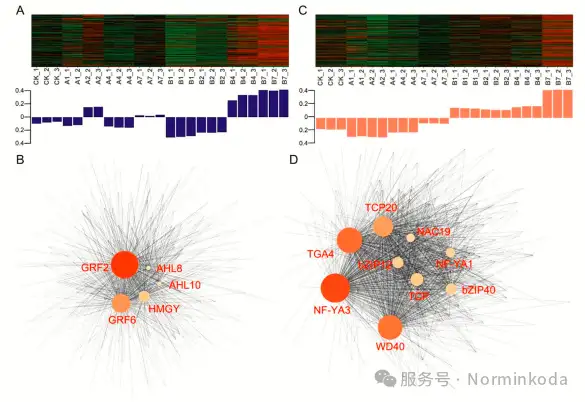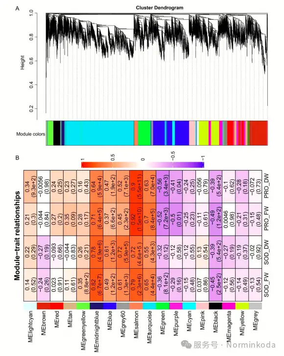 WGCNA分析: 构建基因共表达网络,找出与脯氨酸和SOD活性高度相关的基因模块,并从中筛选枢纽基因(Hub genes),特别是转录因子(TFs)。