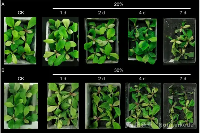 实验设计: 研究使用不同浓度(20%和30%)的PEG-6000溶液对见霜黄幼苗进行干旱胁迫处理,并在处理后的0、1、2、4、7天取样。