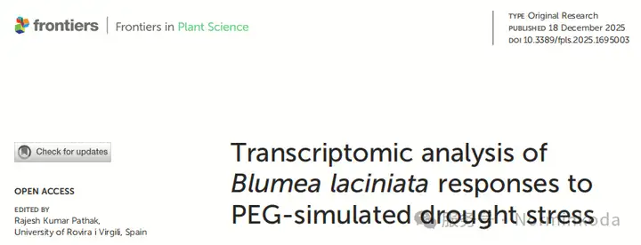 Wang H, Dai Y, Zhang M and Chen Y (2025) Transcriptomic analysis of Blumea laciniataresponses to PEG-simulated drought stress. Front. Plant Sci.16:1695003. doi: 10.3389/fpls.2025.1695003