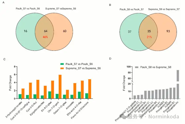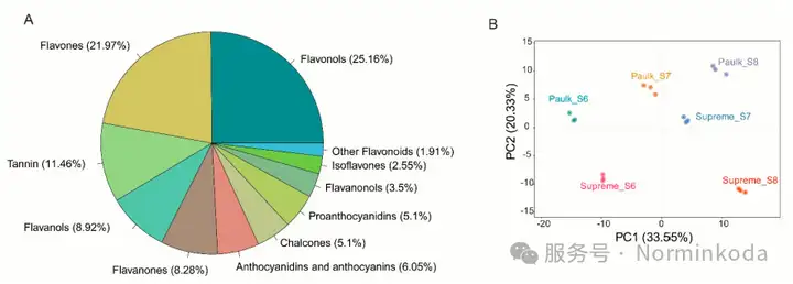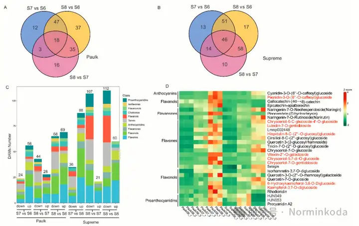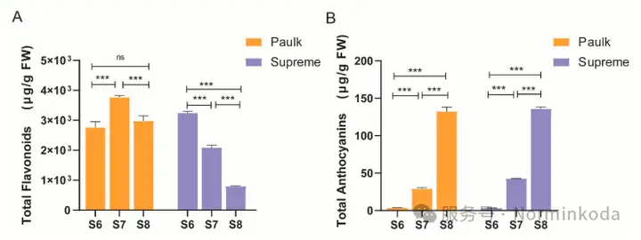 这两个品种在不同生长阶段,积累的类黄酮种类和数量都不一样。比如,Supreme在早期积累的黄酮类物质较多,而Paulk在成熟期原花青素更多。