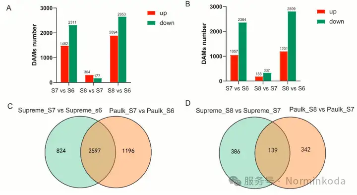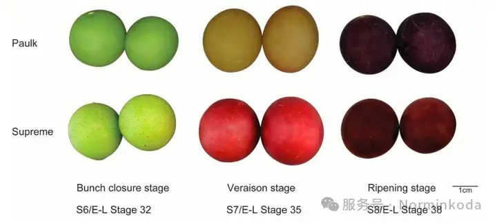 实验材料:取自中国湖北咸宁农业科学院的三年生Paulk和Supreme两个圆叶葡萄品种,在花序闭合期(S6)、转色期(S7)和成熟期(S8)采集样品。