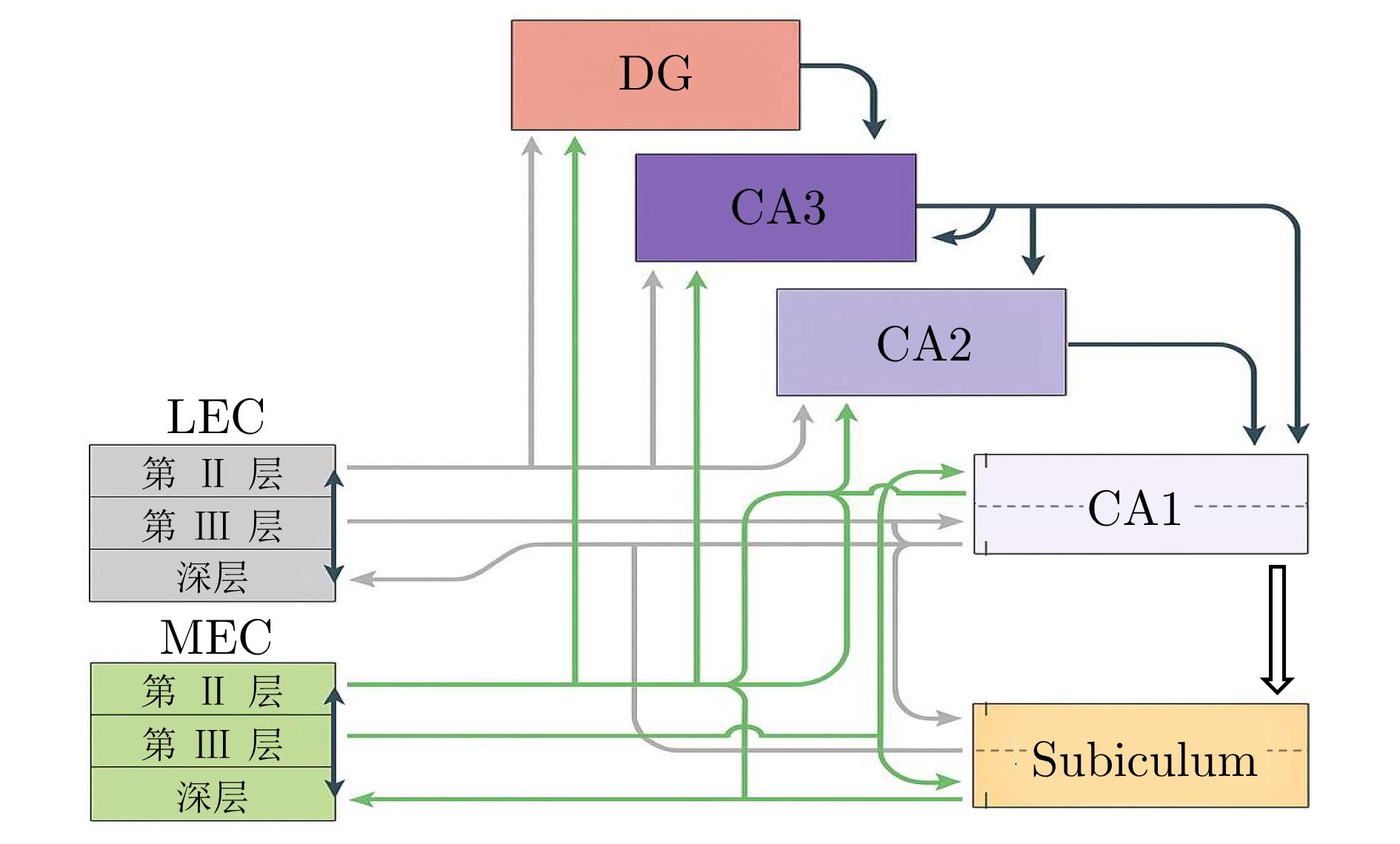情景认知是哺乳动物大脑的一项核心能力, 体现个体在特定时空环境中对事件和信息进行感知、理解、组织和利用的能力. 广义而言, “认知”可被视为基于内部表征所进行的一系列信息计算过程, 涵盖知觉、学习与记忆、推理等子功能[5]. 这一系统能力使动物能够在复杂动态环境中做出适应性反应. 哺乳动物通过整合来自视觉、听觉、触觉、前庭觉等感知通路的信息, 对当前环境形成稳定的情景感知. 感知后的信息经过内嗅皮层(Entorhinal cortex, EC)整合后传入海马体(Hippocampus, HP), 进而形成认知地图(Cognitive map)[6]. 认知地图是情景认知的核心成果之一, 它不仅记录不同地点的位置关系与空间拓扑, 还整合与特定地点相关联的物体、奖励信号甚至行为规则等相关要素[7]. 海马体在时间和空间两个维度上对情景信息进行编码, 是大脑神经记忆系统的核心, 所构建的认知地图实质上就是一种情景记忆, 其形成过程即为典型的情景认知过程[8].