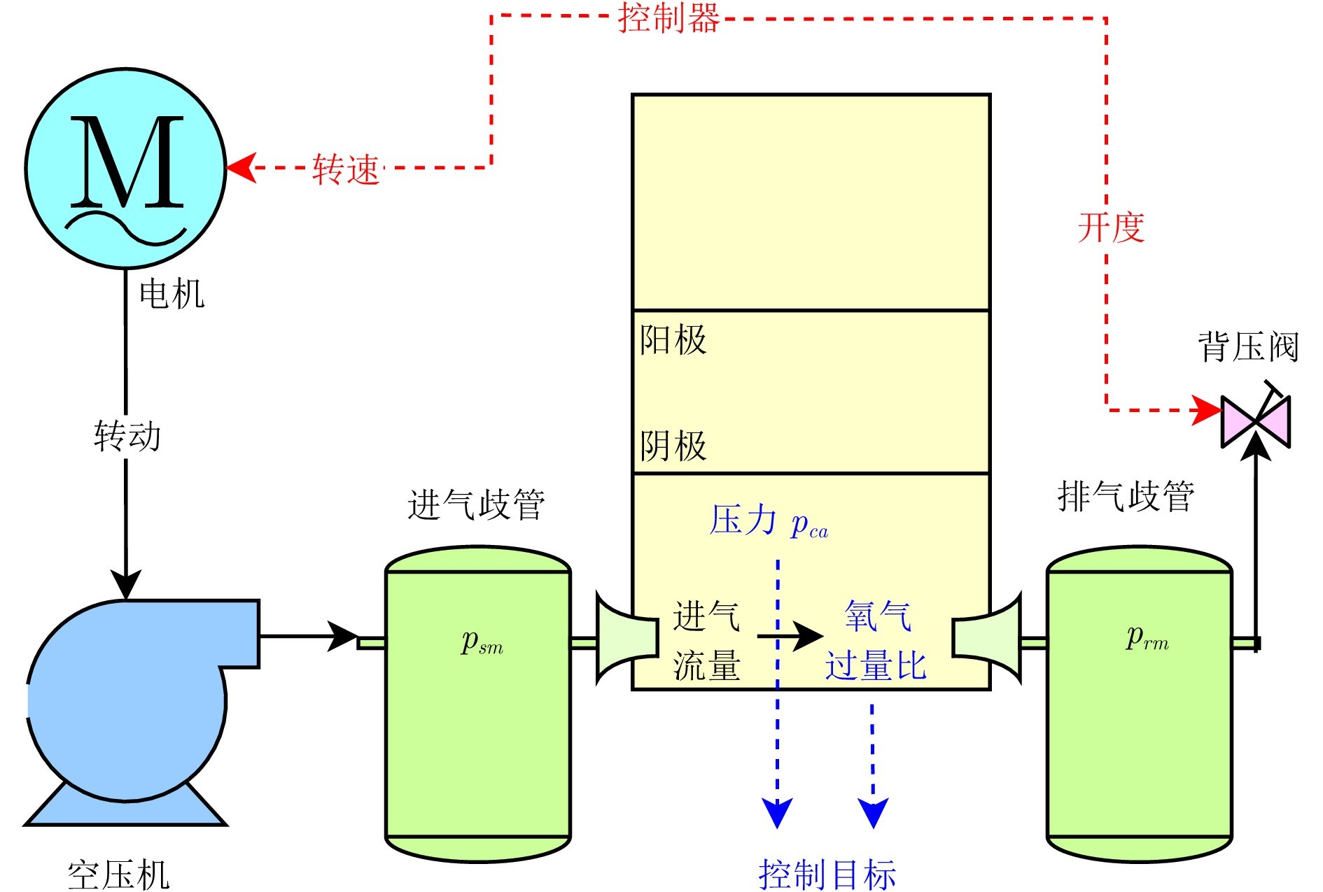 在PEMFC系统中, 空气供给子系统的性能至关重要. 该子系统负责向阴极精确输送反应所需的氧气, 其两个关键控制变量——氧气过量比和阴极压力, 直接决定燃料电池的运行效率与工作寿命. 氧气供给不足(“氧饥饿”)或压力失调不仅会显著降低电池效率, 还可能导致质子交换膜损坏等不可逆的严重后果[8−10]. 因此, 对空气供给子系统进行深入的机理建模并设计高效、鲁棒的控制策略, 对于保障整个燃料电池系统的可靠与高效运行具有重要意义.