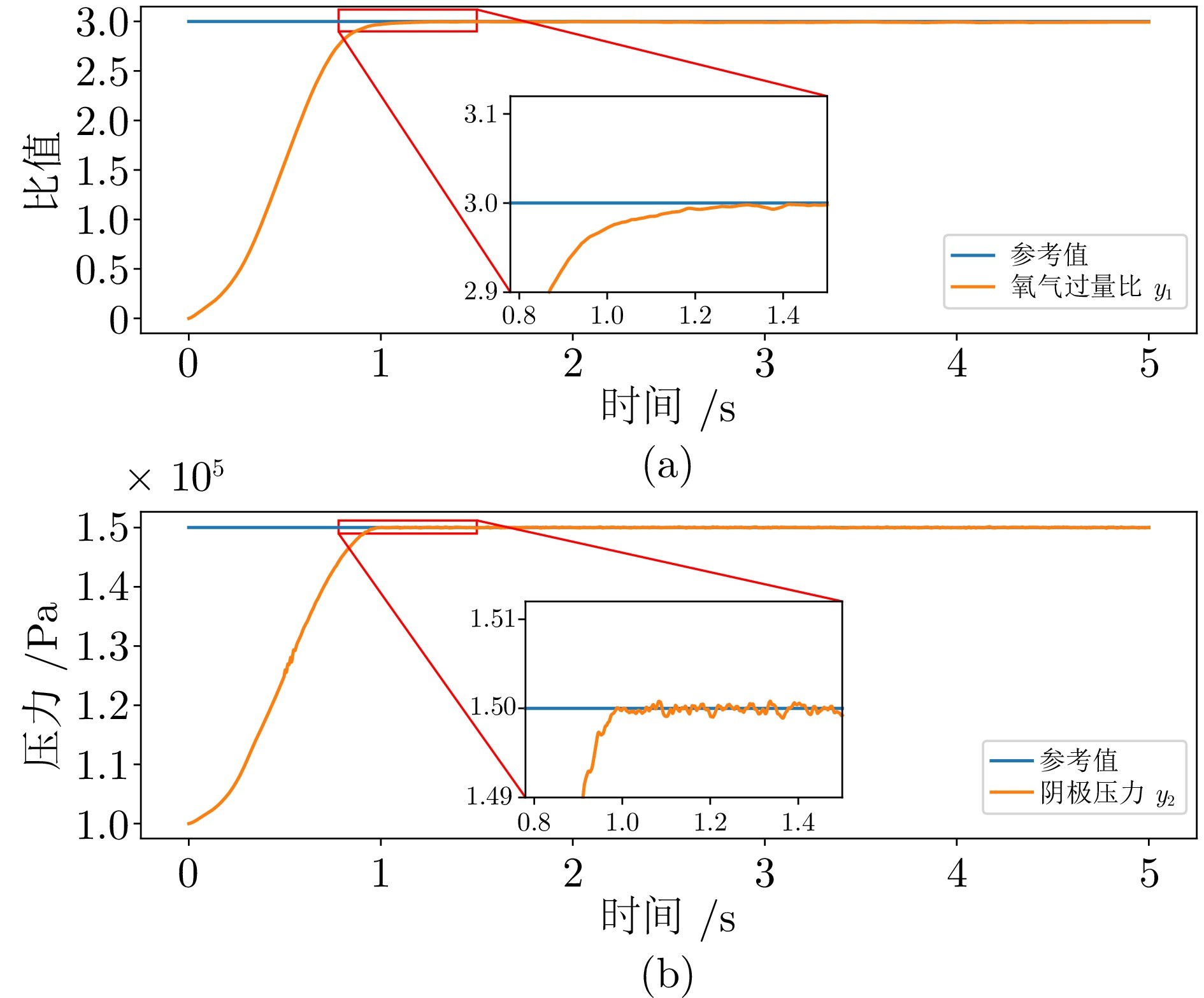 图3 系统控制目标与参考值的对比((a)氧气过量比; (b)阴极压力)