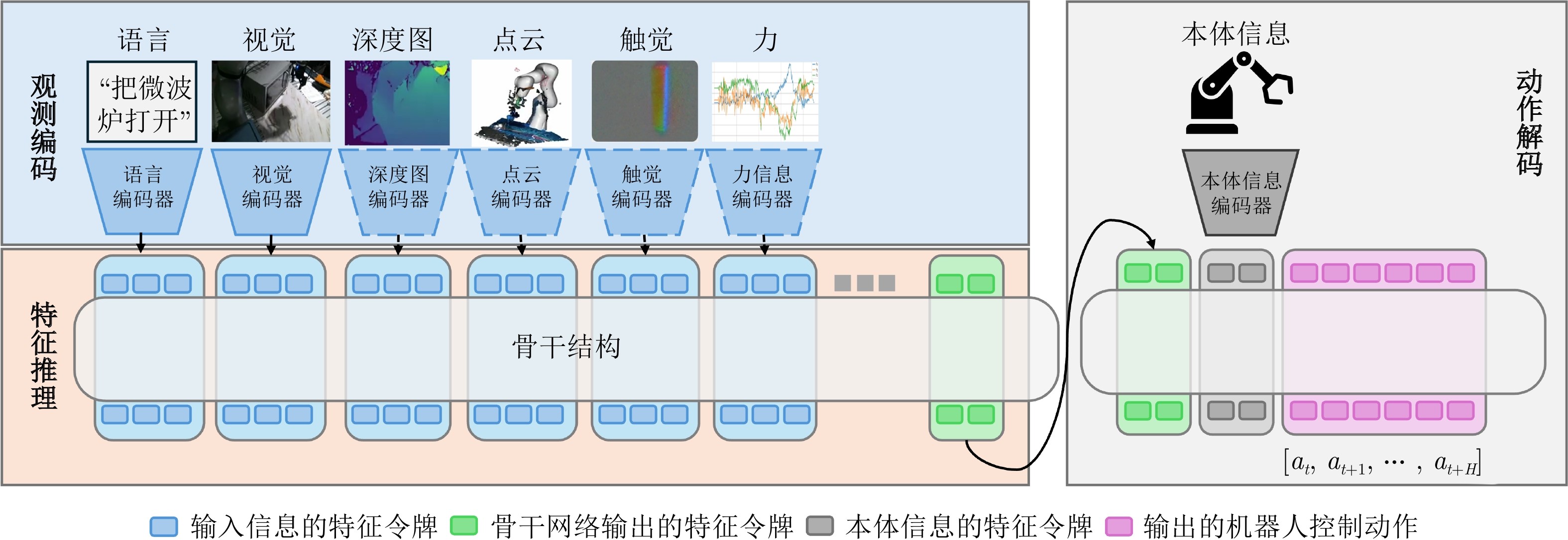 近年来, 具身智能受到学术界和产业界的广泛关注. 相比于传统的互联网智能或离身智能从数据中获取智能, 具身智能系统通过控制“本体”与环境交互, 从而获得智能. 作为具身智能“本体”的典型代表之一, 操作机器人通过控制机械臂与环境进行交互完成抓放、搬运等任务, 在工业生产中被广泛应用. 传统的机器人系统通常由多个不同的模块组合构成. 例如感知模型通过处理传感器数据获取环境状态和操作对象状态; 决策模型则根据当前的状态确定操作目标; 接收到决策目标后, 规划模型根据机械臂与环境状态规划可行路径; 最后由控制模型控制机械臂跟踪该路径以完成任务. 这种模块化的机器人系统可以从各个模块的发展中受益, 并且具有良好的可解释性. 但是当操作机器人推广到日常生活中时, 基于逻辑编排的决策模块和基于搜索或优化的规划与控制模块很难应对开放环境下多样性任务需求以及复杂的交互行为.