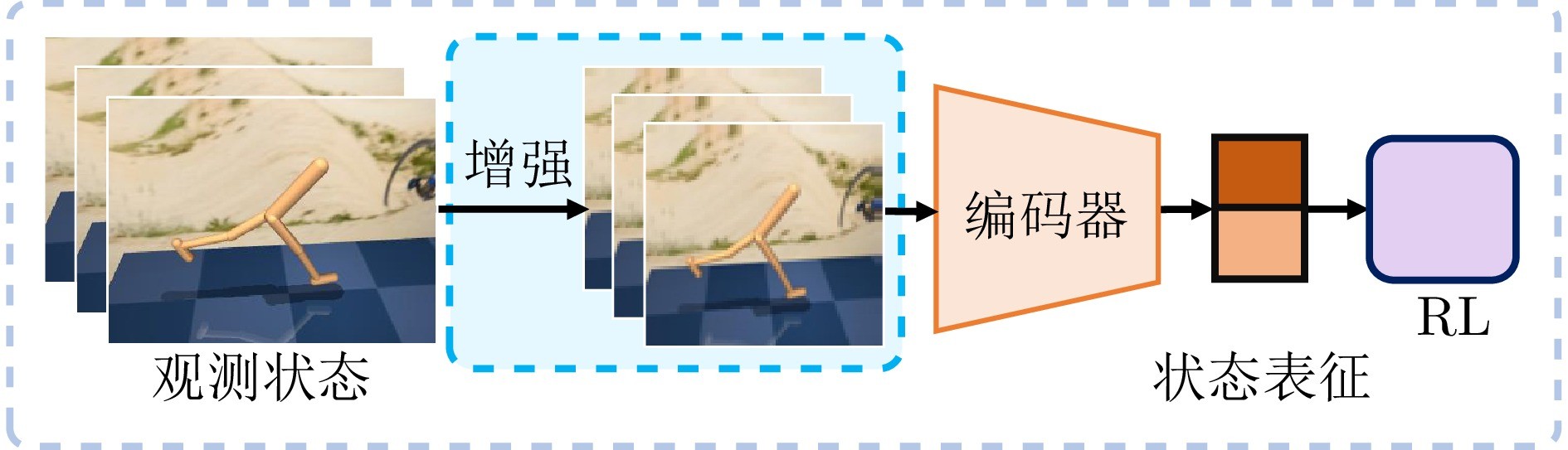 传统的强化学习方法, 如深度Q学习[8]、柔性Actor-Critic学习[9]以及近端策略优化[10]等, 通常依赖人工精心设计的状态输入来引导智能体的学习过程. 然而, 在现实世界中, 大约80%的信息是通过视觉途径获取的[11]. 视觉作为感知外部环境的主要方式之一, 不仅提供海量且高维度的输入数据, 还蕴含环境的丰富细节. 因此, 将视觉信息融入到强化学习框架中, 能够使智能体基于视觉感知做出更为复杂和精准的决策. 基于这一理念, 视觉强化学习[12] (visual reinforcement learning, VRL)逐渐成为人工智能领域的研究热点. 该技术强调利用视觉输入来指导智能体的决策过程, 其核心优势在于能够直接从高维、丰富的图像数据中提取环境特征, 使智能体在面临视觉复杂的任务时能够有效地学习和执行相应的策略.