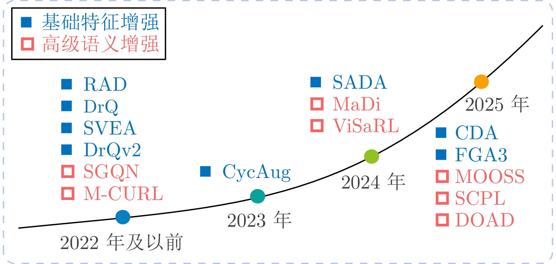 然而, 从高维视觉输入中学习有效策略仍面临诸多挑战. 高维视觉数据通常包含大量与任务无关的冗余信息或噪声, 如何从中准确提取与决策密切相关的关键特征, 构建低维且具有表征力的状态信息, 成为亟待突破的核心难题. 与此同时, 样本效率低下的问题也严重制约着实际应用的发展: 在高维输入下进行策略学习往往依赖海量的环境交互数据, 而现实场景中数据采集成本高昂、交互过程缓慢, 这一矛盾显著限制了模型的训练效率和应用可行性. 因此, 在交互数据有限的条件下, 如何提升智能体从高维视觉输入中提取关键信息的能力, 以实现其在复杂视觉环境中的高效与稳健决策, 已成为当前研究的热点与难点.