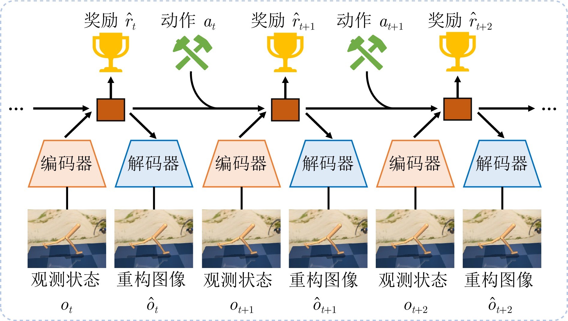 图3 模型增强型视觉强化学习示意图(以基于世界模型的视觉强化学习为例)