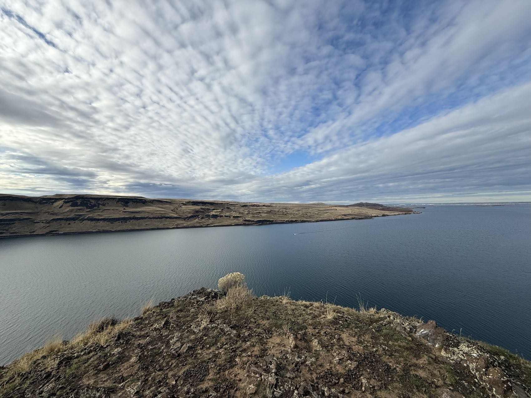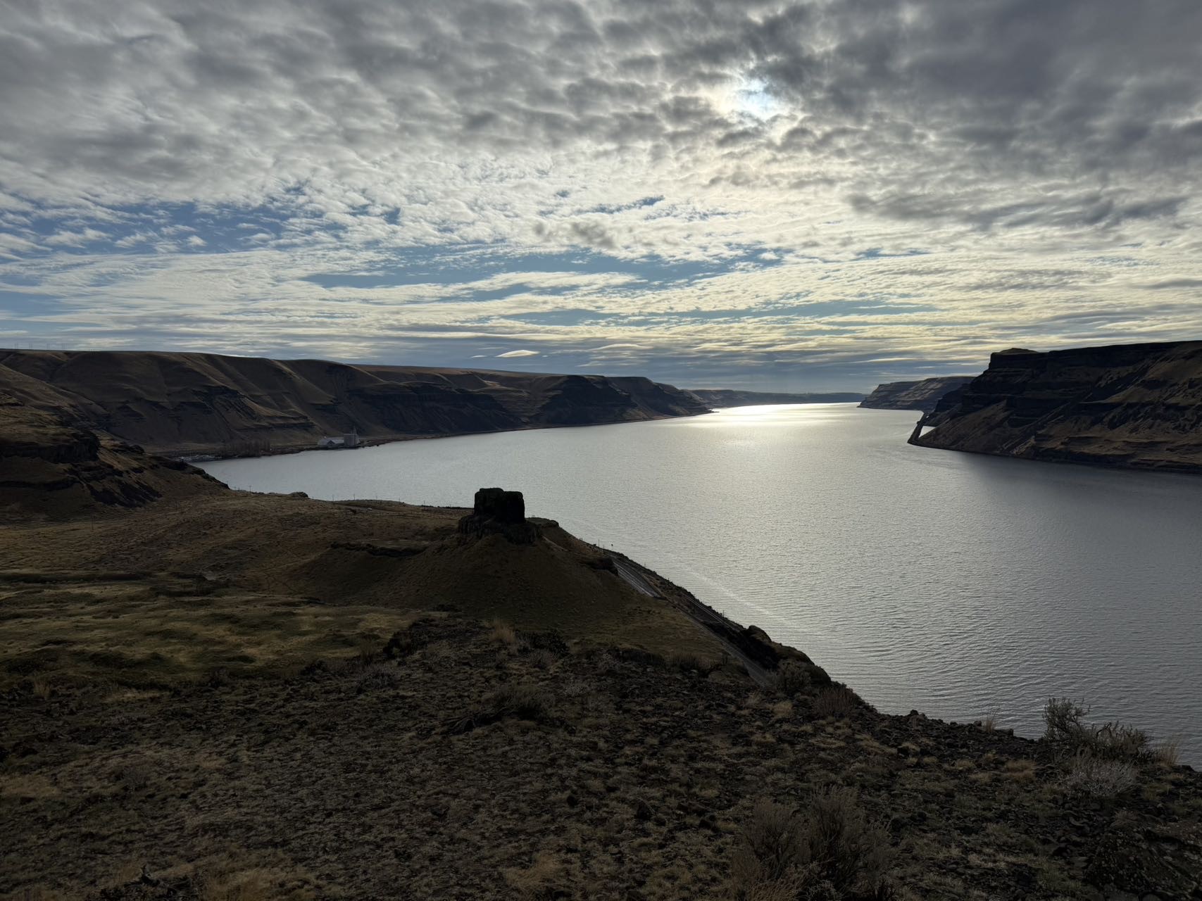 随着步道缓缓攀升,视野也越发开阔。哥伦比亚河在远处铺展,如一道深蓝色的刻痕,映照着天空与山峦。水面被风吹起微光,河心的游艇和拖轮缓缓前行,推着长长的驳船逆流而上。它的速度慢得几乎让人以为静止,但越看越能感受到那种沉稳而持久的力量——一种与大河搏斗、又与大河共生的力量。