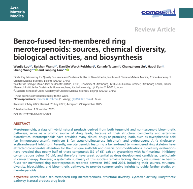 近日,中国中医科学院中药研究所/中药资源中心郭兰萍研究员、王升研究员联合法国国家科学院植物分子生物学研究所Danièle Werck-Reichhart教授及日本京都大学Kanade Tatsumiz助理教授,在国际期刊Acta Materia Medica上发表了题为“Benzo-fused ten-membered ring meroterpenoids: sources, chemical diversity, biological activities, and biosynthesis”的综述论文。团队系统总结了1980年至2024年间报道的苯并十元环杂萜的来源、化学多样性、生物活性与生物合成,探讨其在抗癌药物开发中的潜力与未来研究方向,为后续研究提供参考。