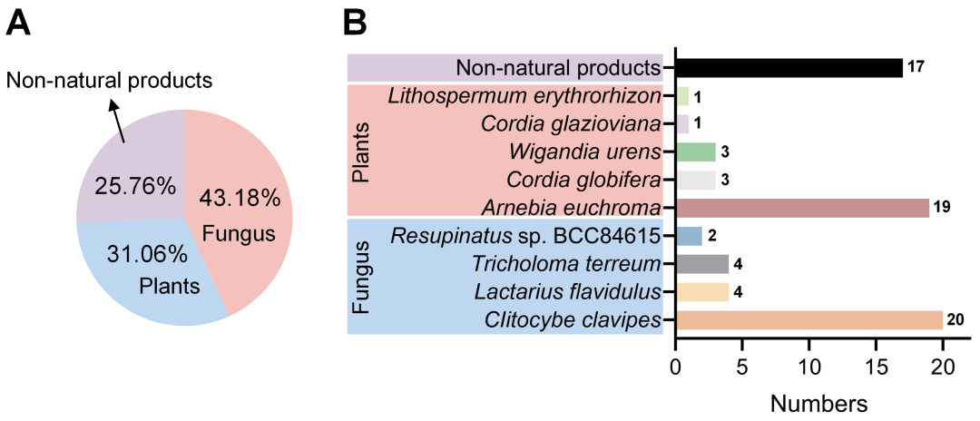 在已报道的66种苯并十元环杂萜中,74.24%为来自植物或真菌的天然产物,25.76%为化学修饰得到的衍生物。根据骨架结构的不同,这些化合物可分为6/10双环、6/10/5三环和杂环融合三种主要类型,且伴随着氧化、甲基化、羟基化、糖基化等多种后修饰,为其多样的生物活性提供了支持。