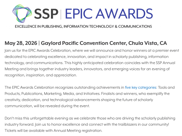 展望2026年,EPIC奖项将继续作为行业创新风向标,获奖者将在SSP第48届年会上获得表彰。这一平台不仅提供庆祝机会,更创造相互学习的空间。对于学术出版专业人士而言,参与奖项申报、评审或指导工作,既是展示自身创新的机会,也是对“知识共享价值值得捍卫”这一理念的实践。在当前环境下,通过严谨、卓越和创新来强化社区建设显得尤为重要。EPIC奖项的实践表明,学术出版行业正通过自我革新来应对时代挑战,这些努力将共同构筑一个更 robust、透明和包容的知识生态系统。作为开放科学运动的积极参与者。