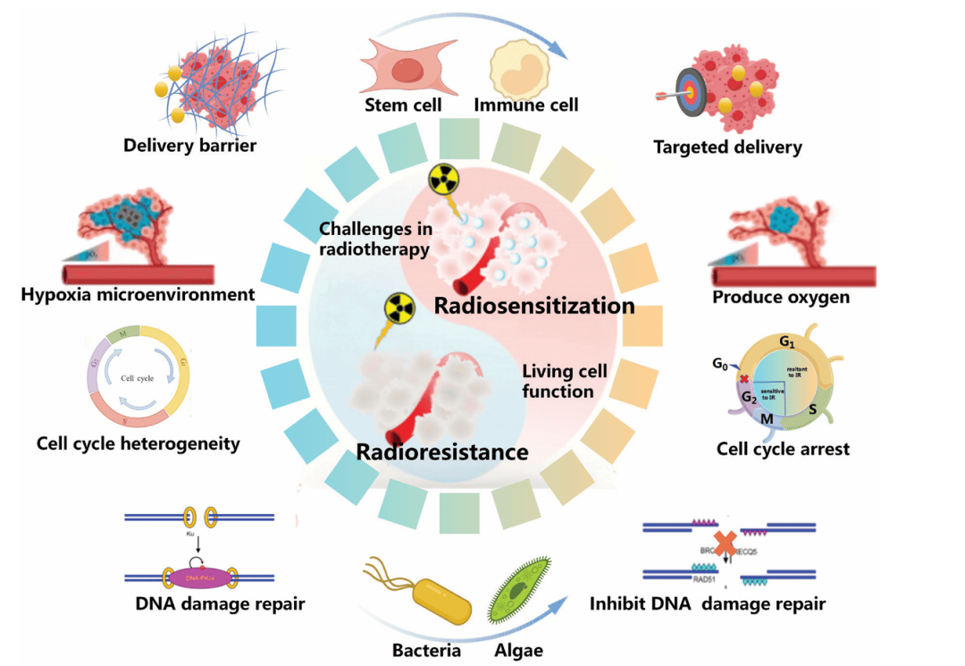 放疗(RT)是癌症治疗的基石之一,但肿瘤细胞的“顽强抵抗”常常令治疗陷入僵局。DNA损伤修复激活、细胞周期异质性、严重的缺氧微环境以及免疫抑制,构成了肿瘤耐药的“四大护法” 。传统的化学增敏剂虽然有效,但往往面临靶向性差、毒副作用大且在肿瘤内滞留时间短的困境 。
