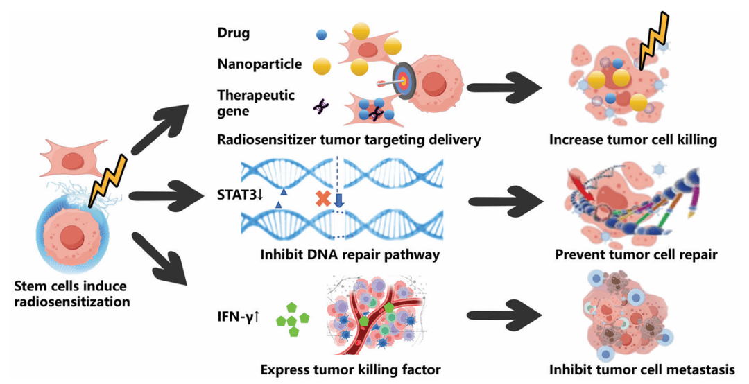 抑制DNA修复: 间充质干细胞(MSCs)可通过下调 STAT3 信号通路,抑制肿瘤细胞的DNA修复能力,使其对辐射更敏感 。