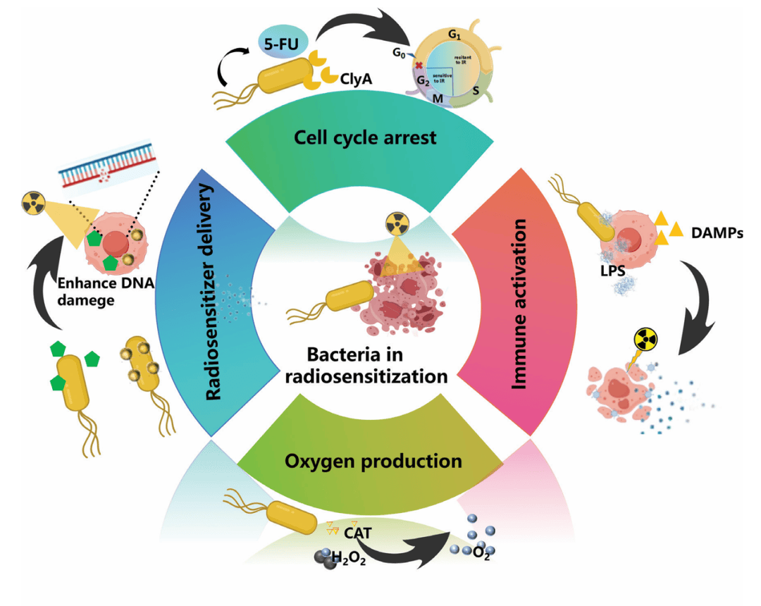 图4 细菌在肿瘤放疗增敏中的应用。本图展示了工程化细菌在放疗增敏中的策略及具体应用实例,包括:递送放疗增敏剂、改善厌氧环境、调控细胞周期以及激活免疫反应。