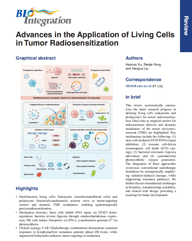 引用方式:Xu Hn, Feng Rj, Liu Hr. Advances in the Application of Living Cells in Tumor Radiosensitization. BIO Integration. 2025. Vol. 6(1). DOI: 10.15212/bioi-2025-0097