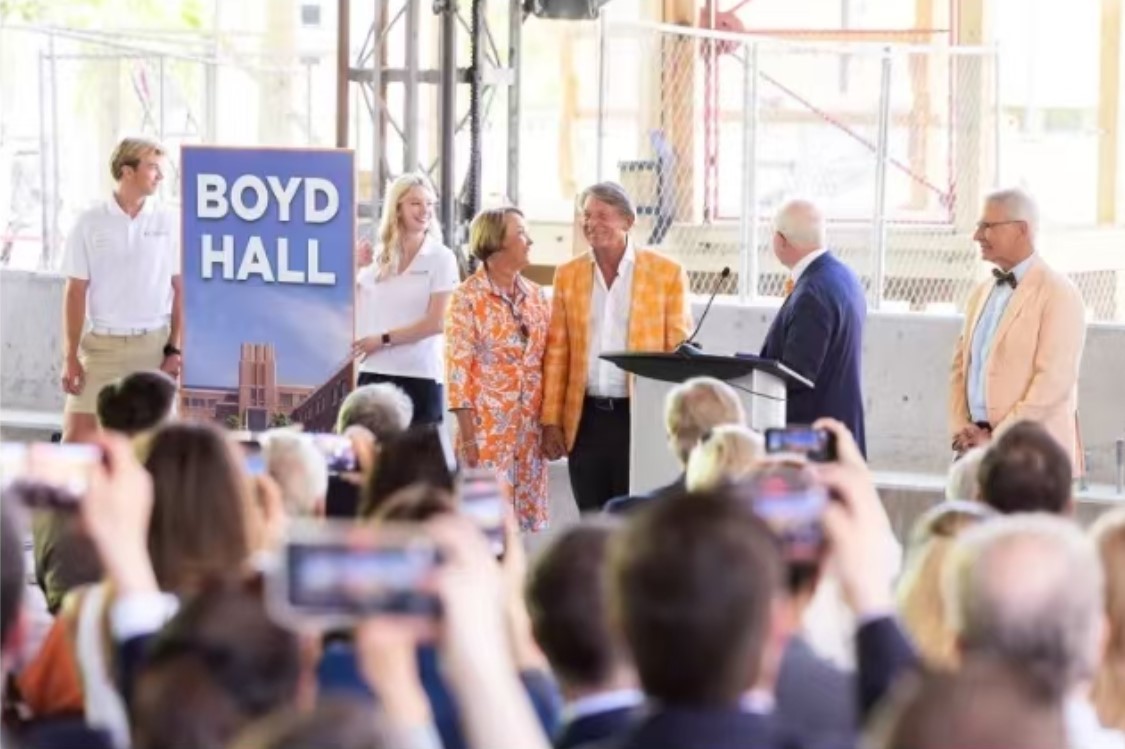 The new Haslam College of Business building will be named for UT System President Randy Boyd, pending UT Board of Trustees approval. Leaders hosted a topping off ceremony, celebrating the placement of the final structural beam at the highest point of the building.