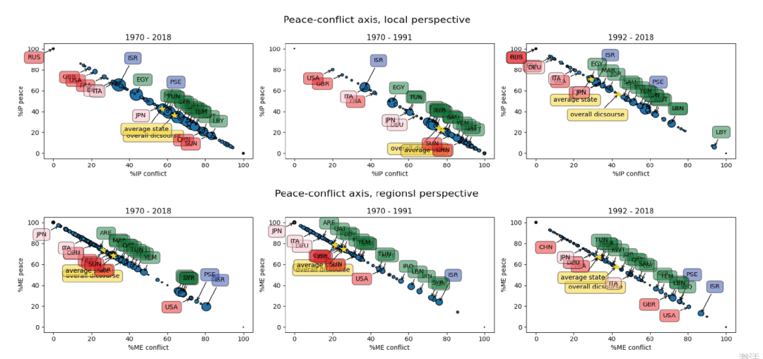 图2. 各国家在和平Vs.冲突轴线上的立场分布。 上:巴以视角(IP);下:中东视角(ME)。