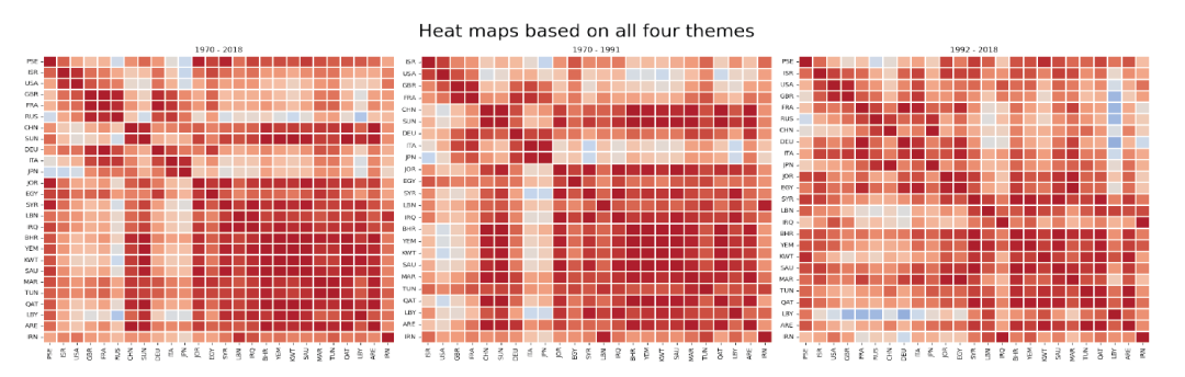 确定三个时间段:1970 - 1991 年、1992 - 2018 年以及 1970 - 2018 年(整个语料库),覆盖了冷战结束,马德里和平会议,911恐怖袭击和2000年坎大哈峰会这些特殊时间点。