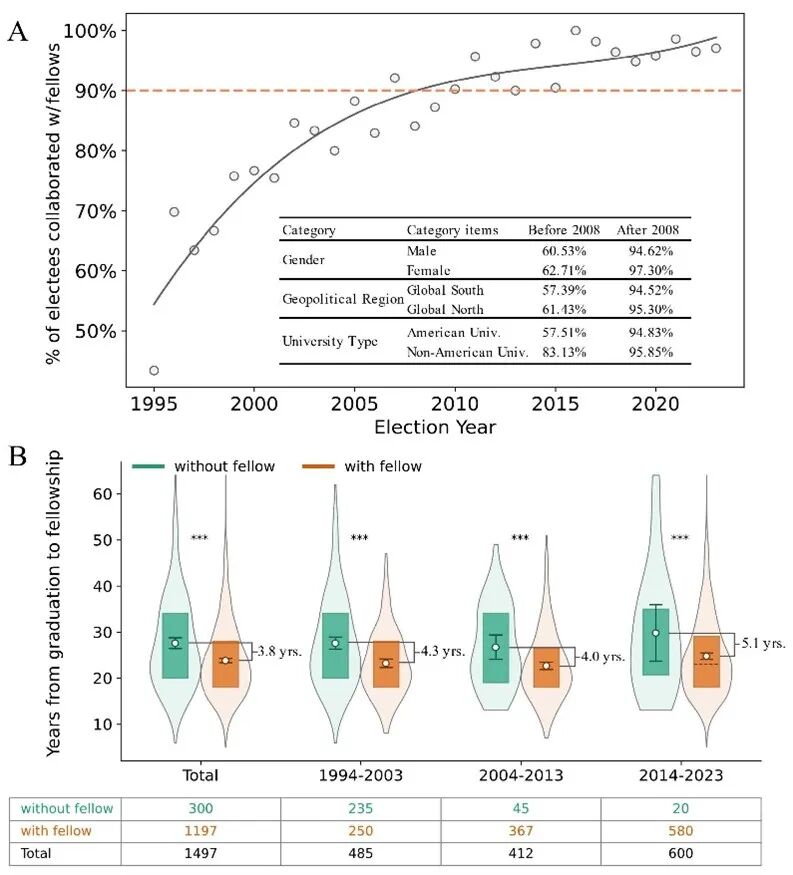 平均而言,与ACM会士合作过的研究者比没有合作的人提前3.8年获得会士称号。而在最近十年,这一差距甚至扩大到了5年以上。