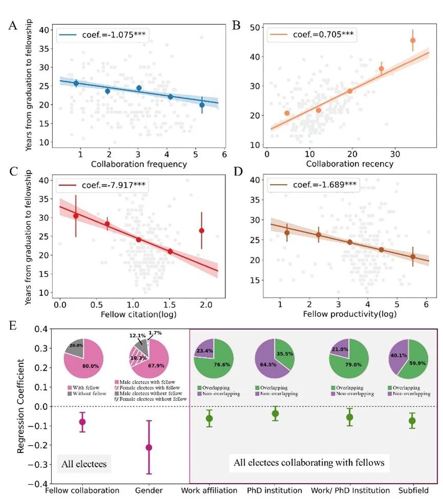 图 2. 合作模式(A、B)、合作者的声望(C、D)、社会因素(E)与从毕业到获得 ACM 会士所用时间之间的线性回归关系。