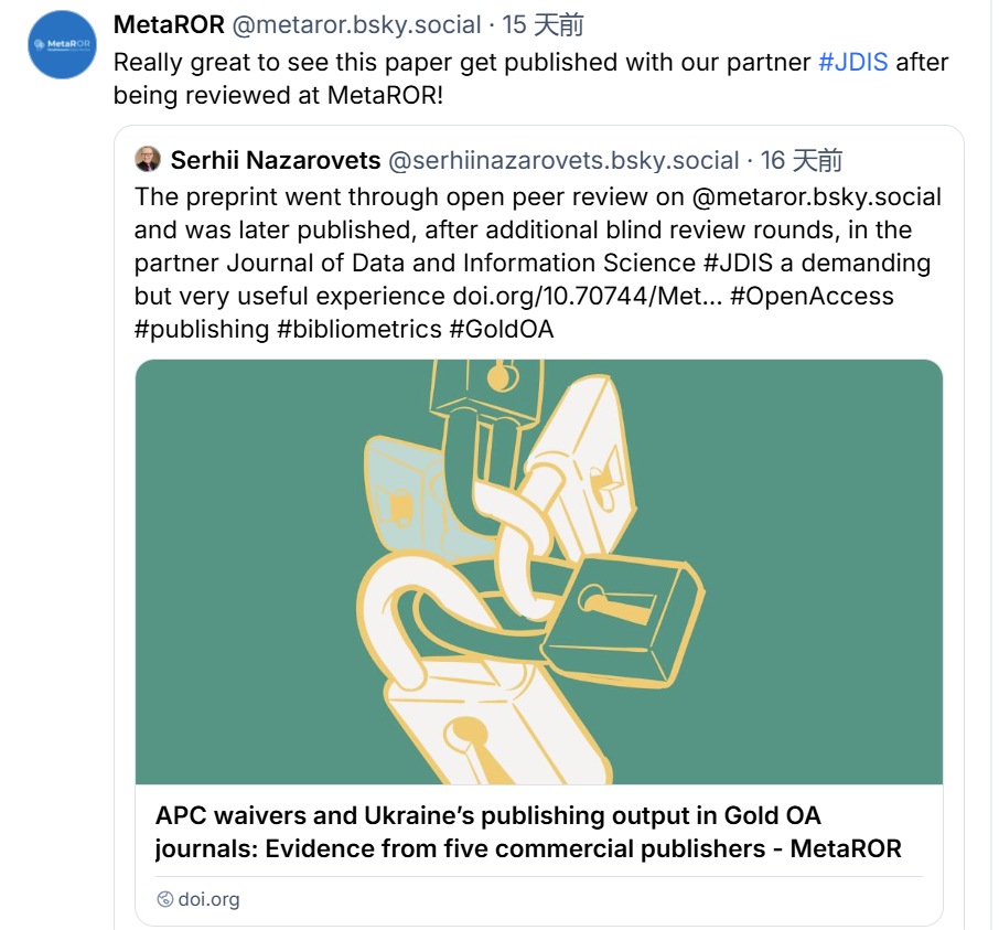作为国内积极践行开放科学的期刊之一,JDIS 持续开展了相关探索(相关推文:JDIS 成为 MetaROR 官方合作期刊)。这种跨平台的互动与反馈,展现了开放评审机制与传统期刊出版之间良性互补的潜力。