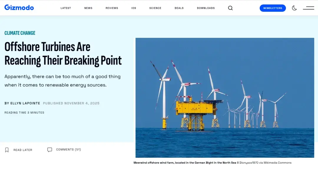 2025年11月,南方科技大学曾振中团队在《自然-通讯》发表的一项研究指出,亚洲和欧洲超40%的海上风电场——包括现有设施以及规划中的项目——正面临极端大风的挑战,部分风力已超过涡轮机的设计极限。这篇题为“Increasing extreme winds challenge offshore wind energy resilience”的研究论文,经新闻稿传播后,被 Gizmodo、德国《明镜周刊》 等国际媒体报道,引发了关于海上风能基础设施韧性的广泛讨论。