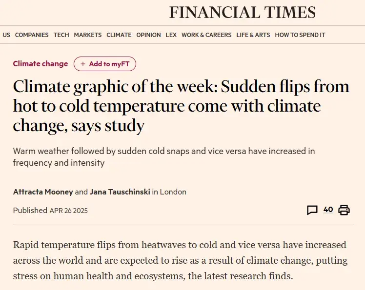 ▲Financial Times报道了该论文,指出温暖天气后紧随寒流来袭或寒冷天气后突然转暖的现象正日益频繁且剧烈地发生