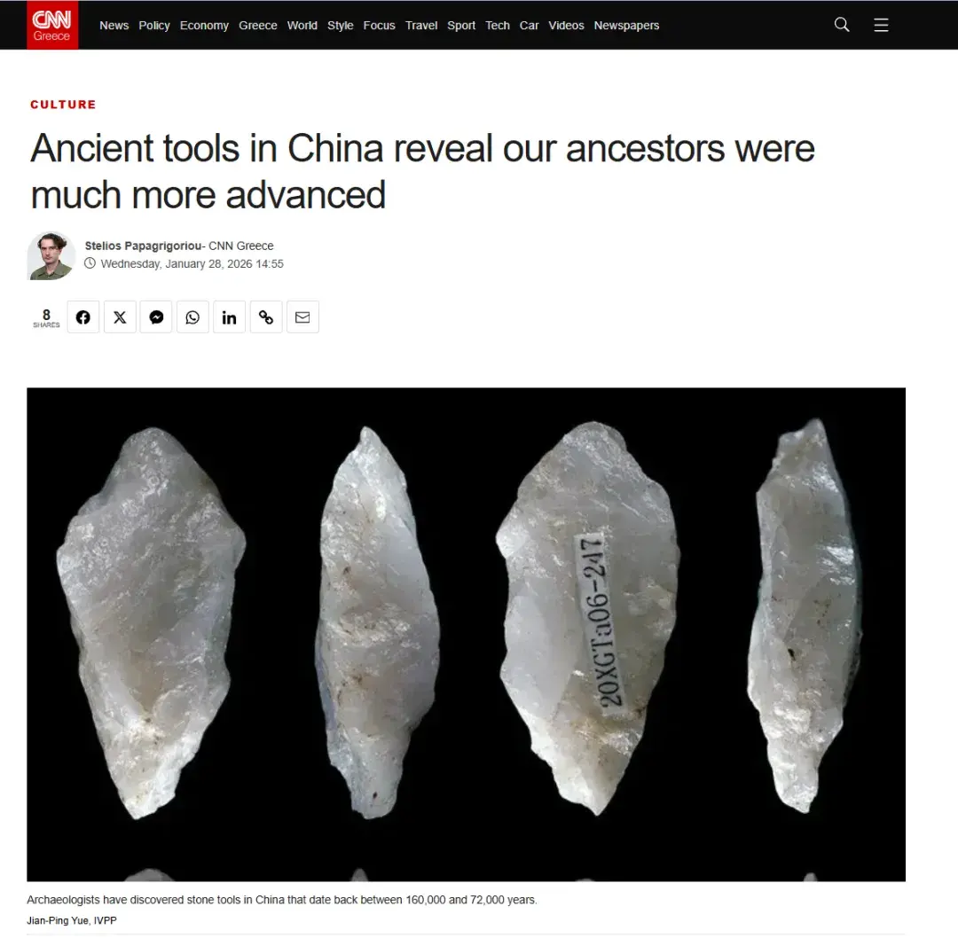 2026年1月,Nature Communications《自然-通讯》发表的一项研究重塑了对人类工具技术演化的认知。该成果来自中国科学院古脊椎动物与古人类研究所的杨石霞团队,经传播团队向全球媒体发布之后,相继被《人民日报》、新华社、CNN Greece、Discover 等国内外主流媒体报道,获得了大量关注 。