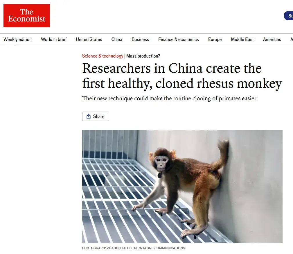 ▲The Economist以“中国科研人员培育出首只健康的克隆恒河猴”为题报道了该研究