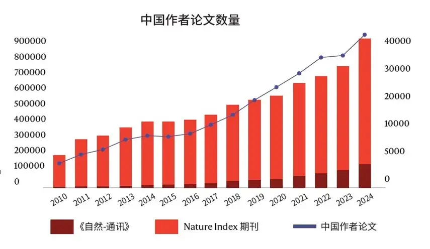 ▲ 根据 Dimensions 数据,近十年来,中国作者发表的论文数量持续攀升,科研质量也在不断提升。自然指数也显示,中国高质量自然科学产出在 2022 年首次跃居全球首位。