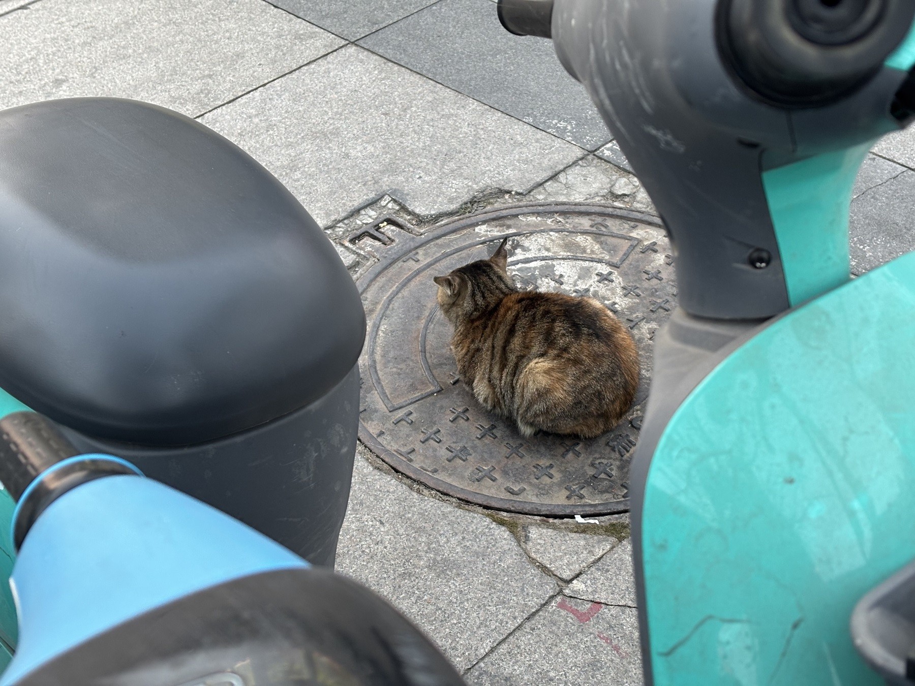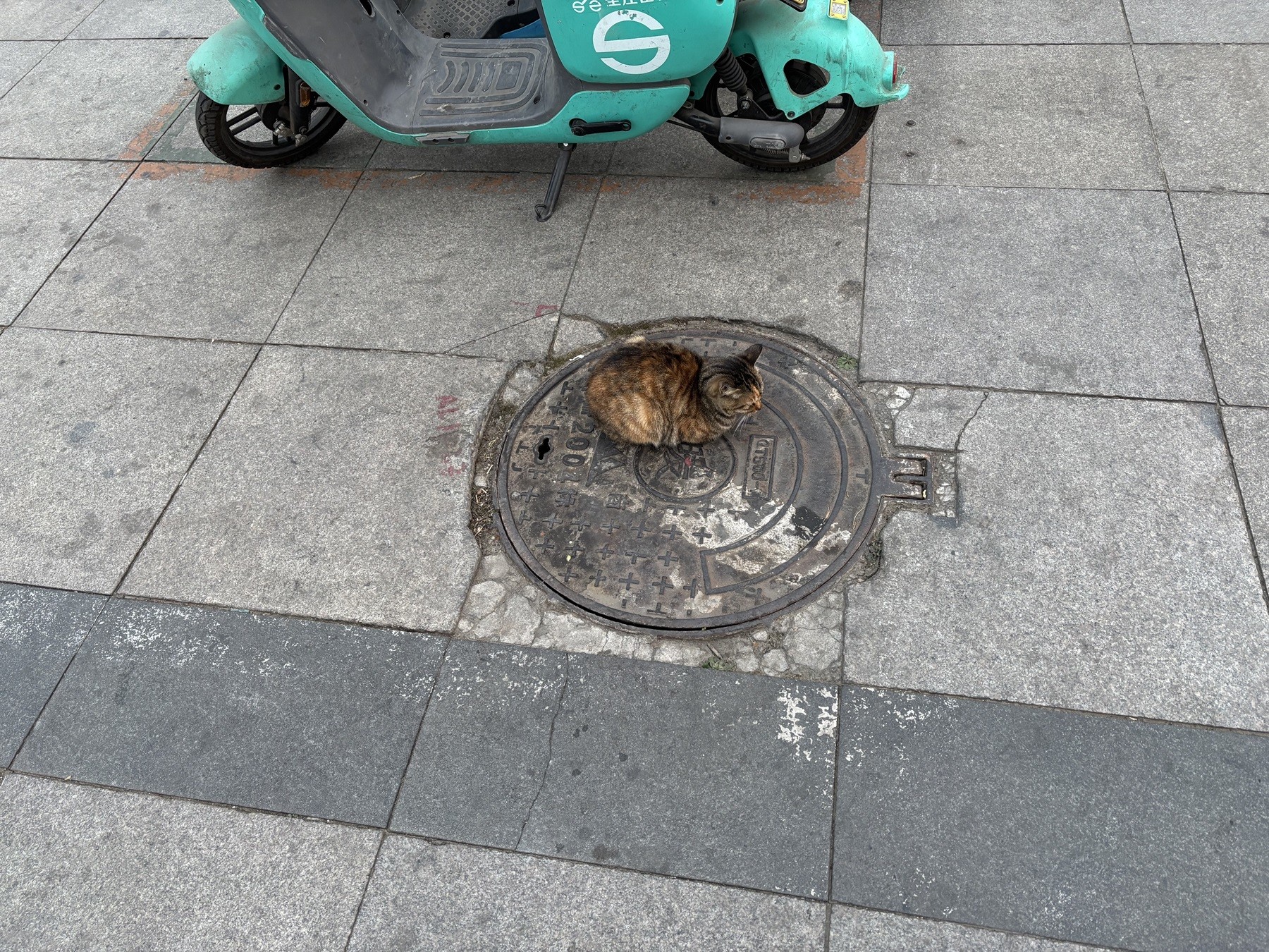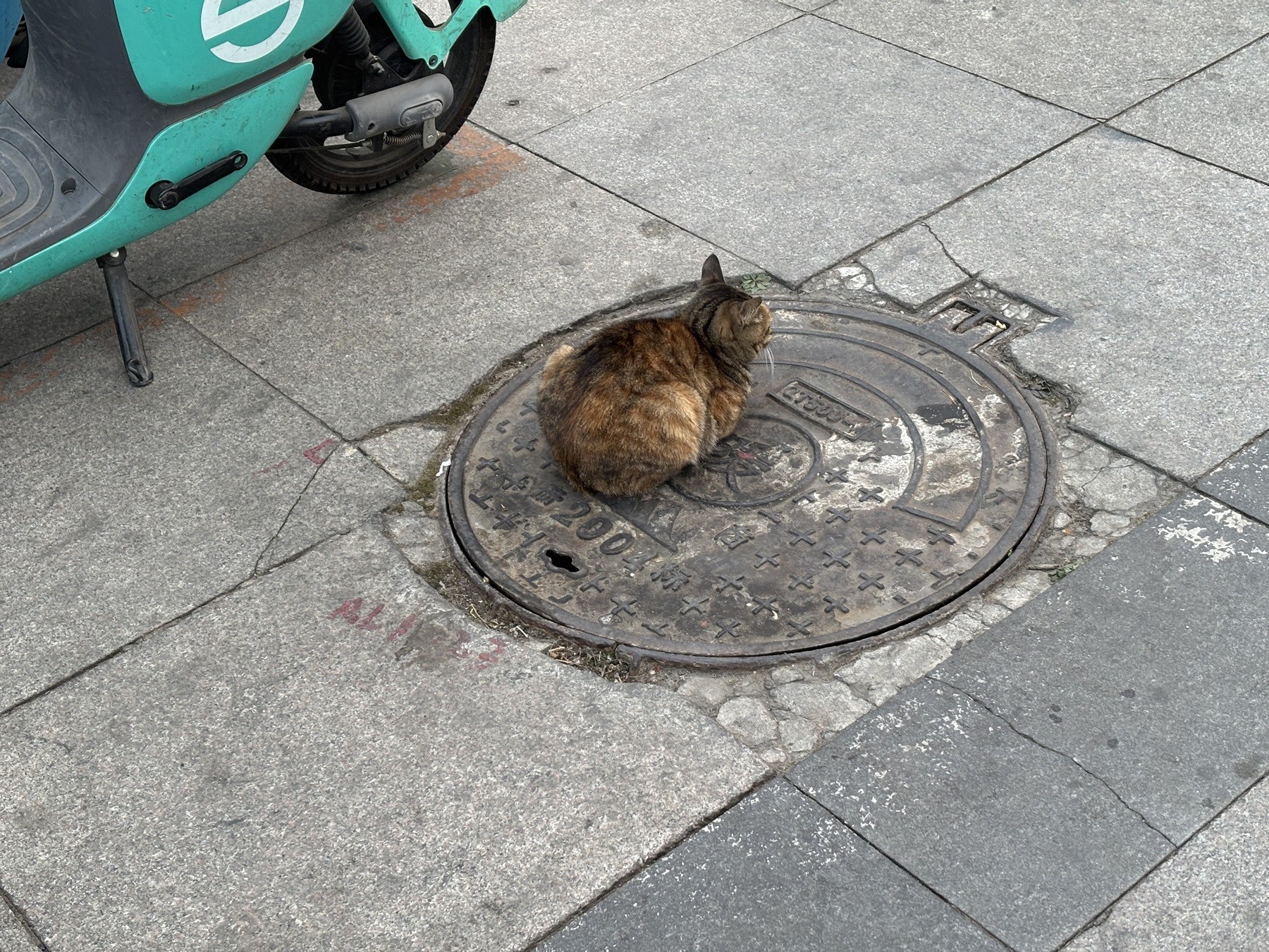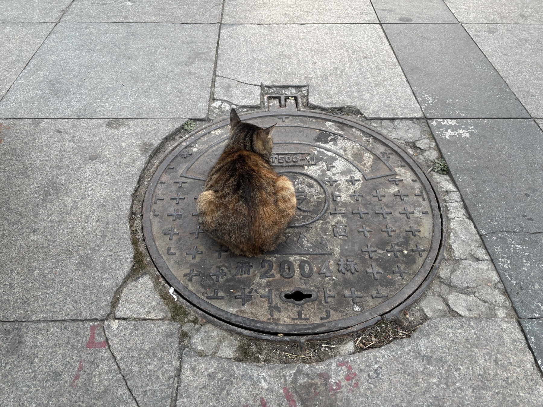 The little cat lies on a cover on manhole.