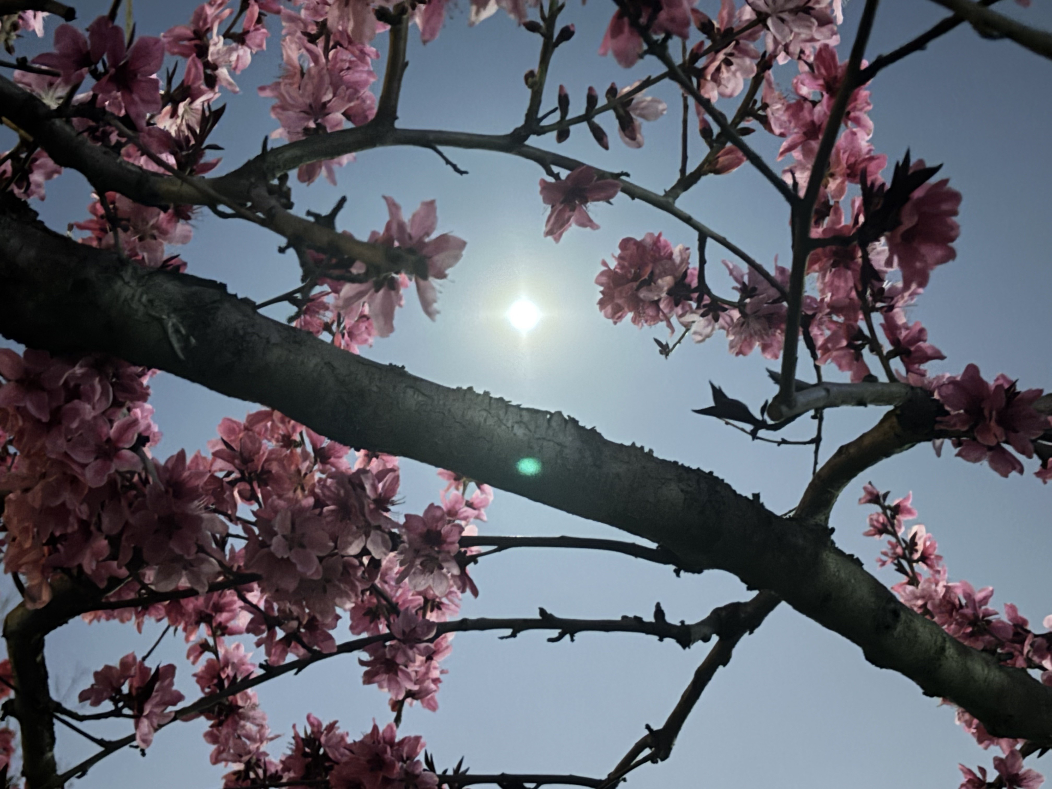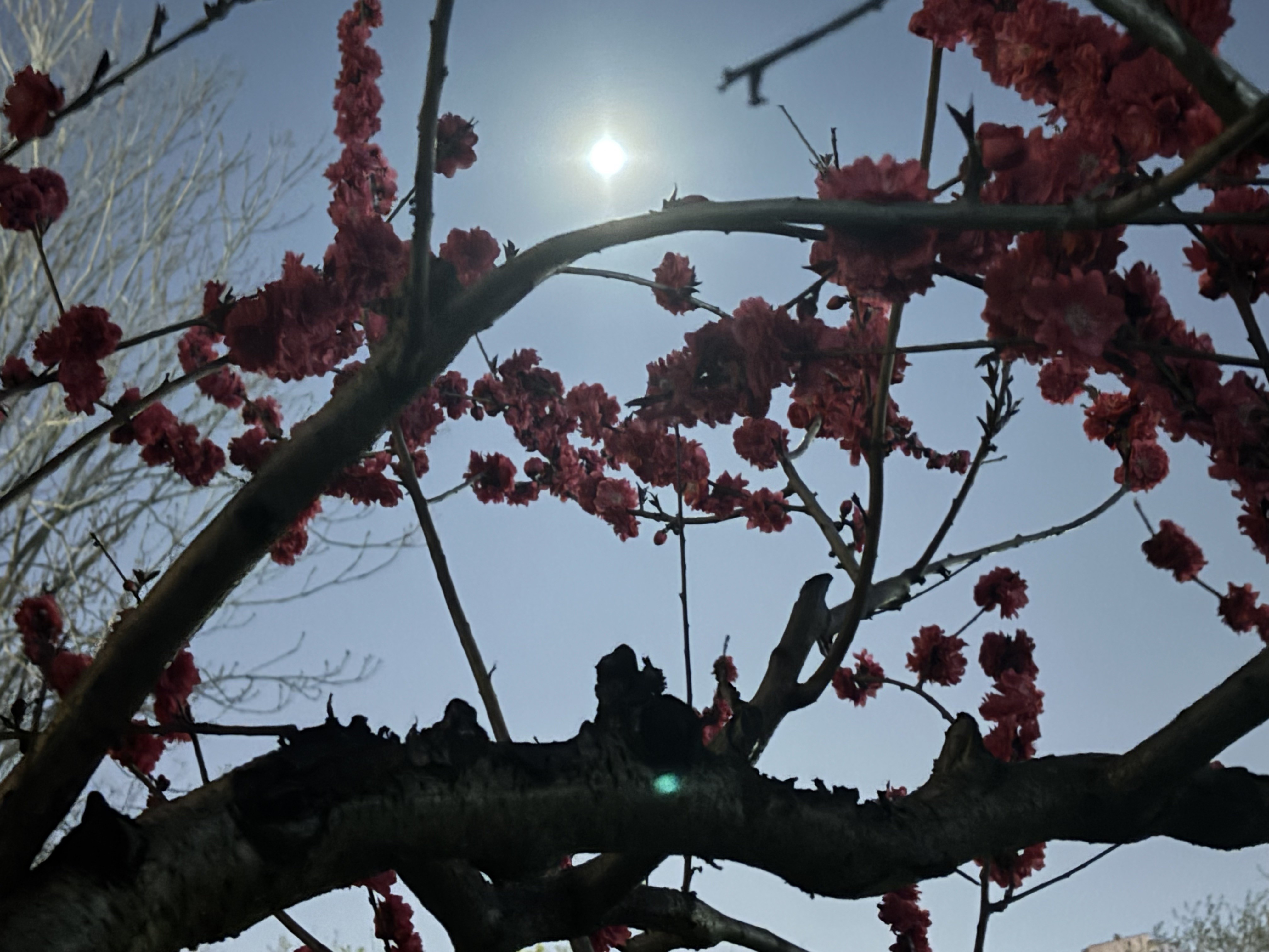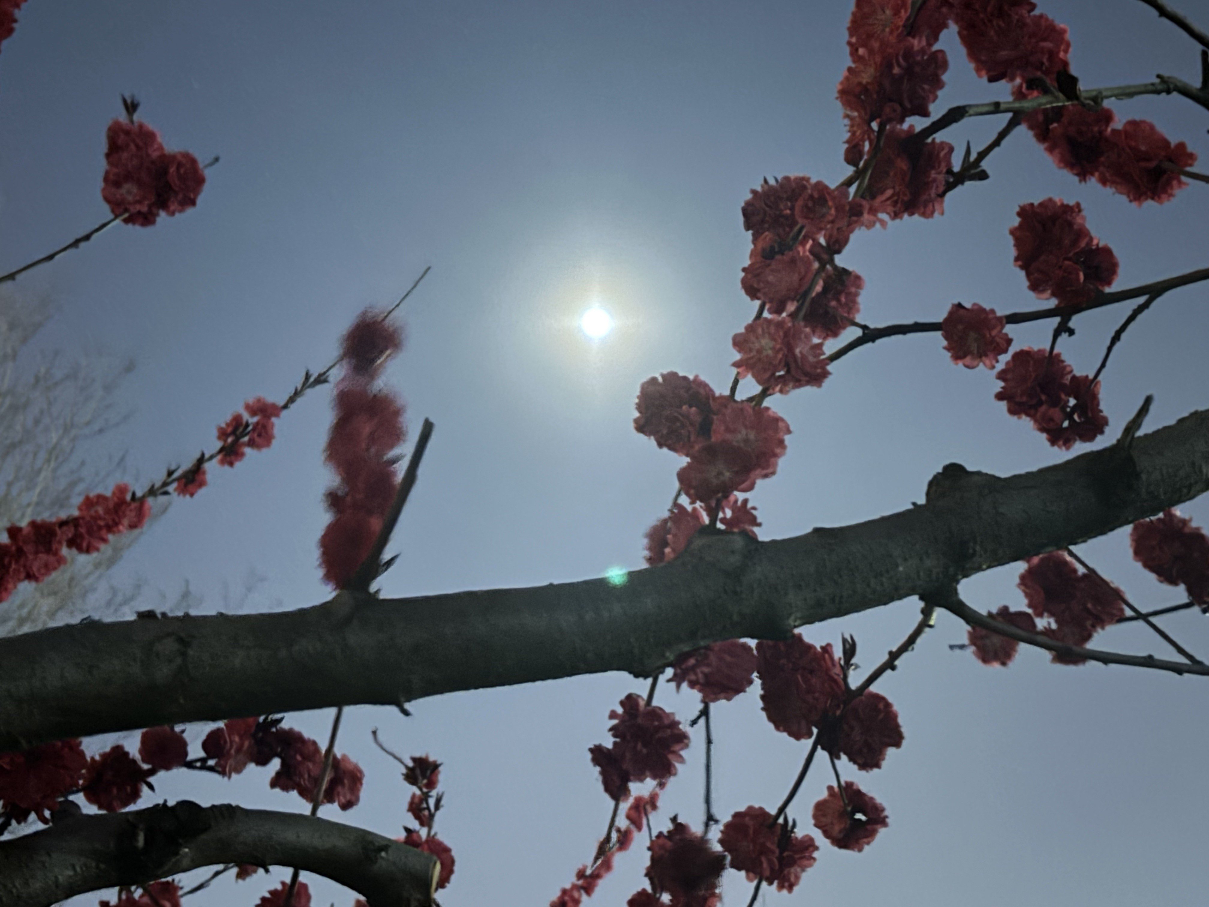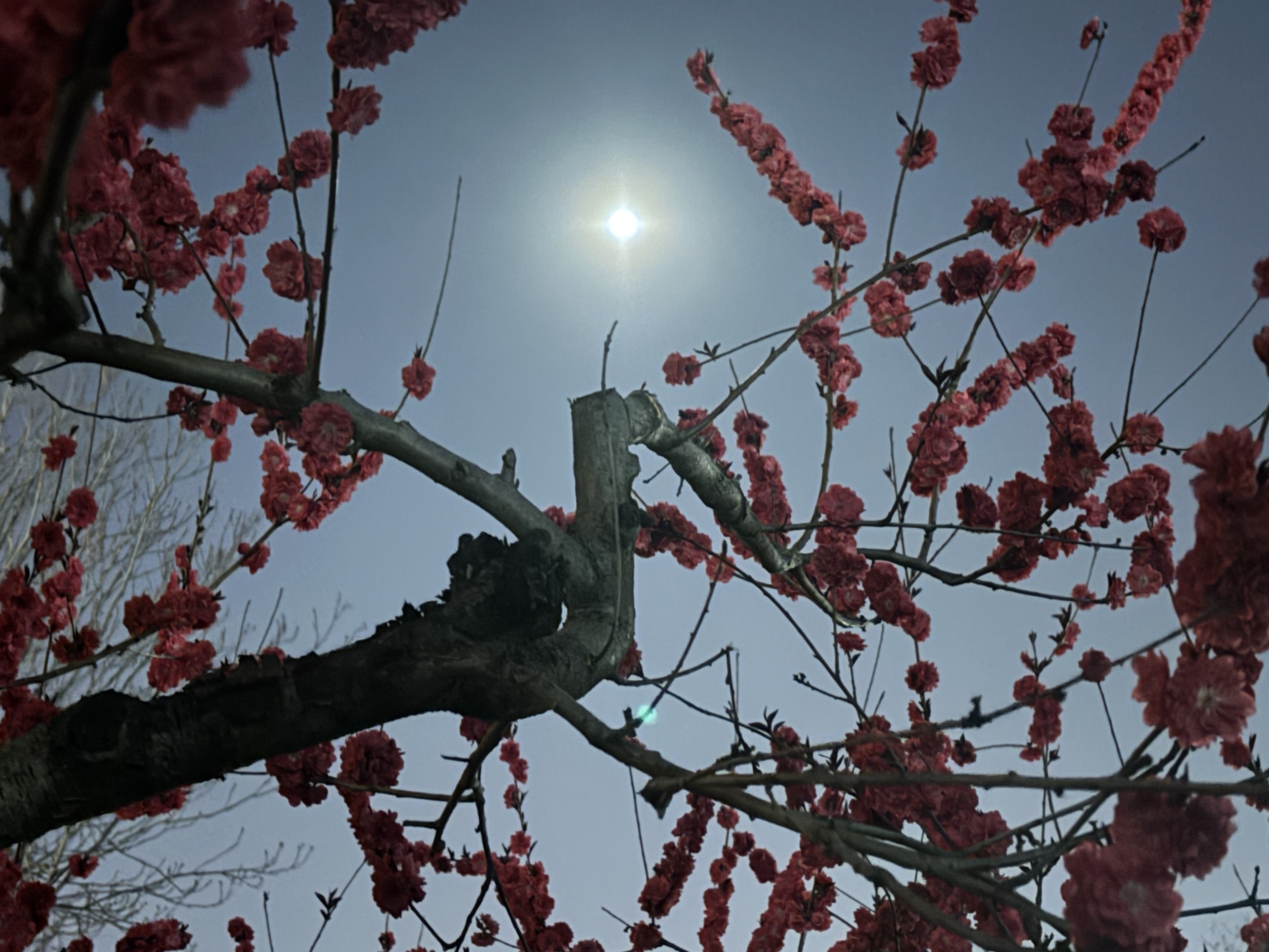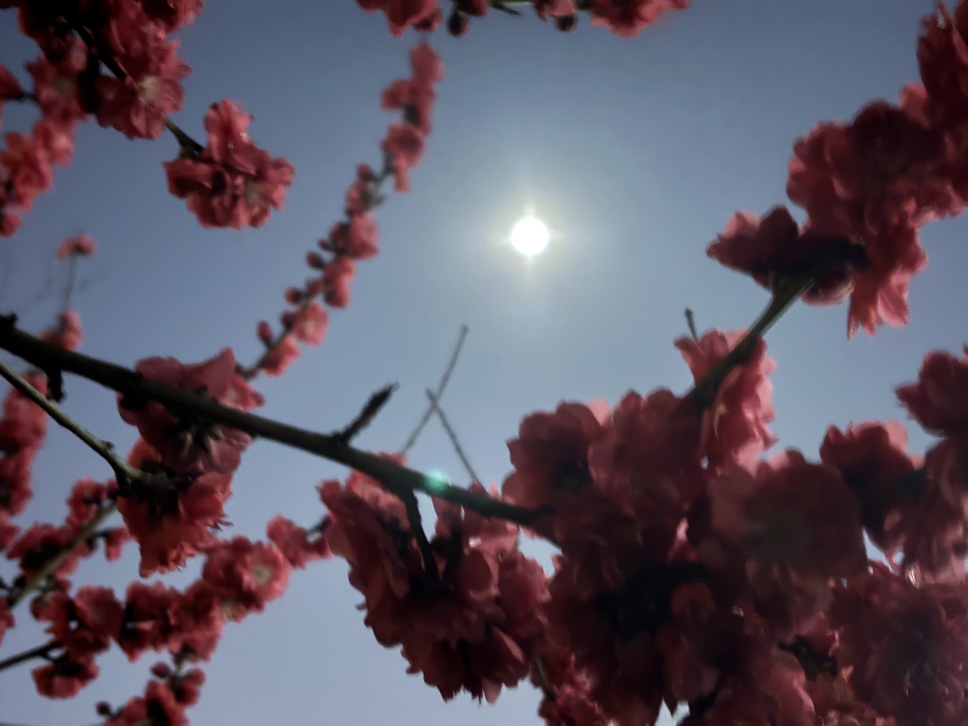 Luxuriant peach blossoms mirror the moon, aglow in red,