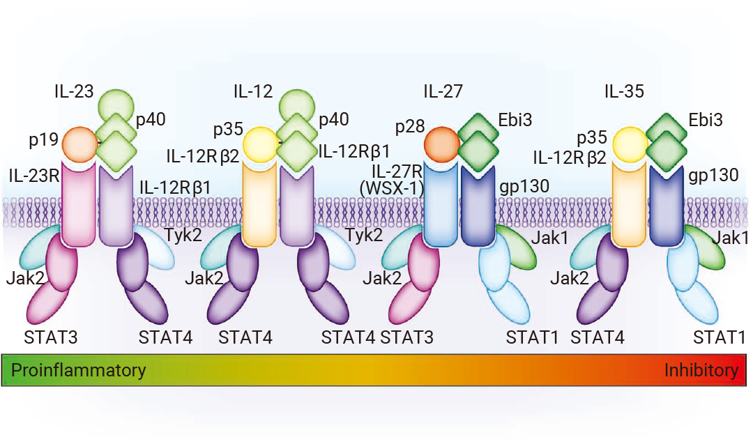 白细胞介素 12 (IL-12) 家族是由异二聚体细胞因子组成的细胞因子家族,包括 IL-12、IL-23、IL-27 和 IL-35 (图 2)。这一特性赋予了这些细胞因子独特的连接和功能相互作用,这是其他细胞因子家族所不具备的[2]。
