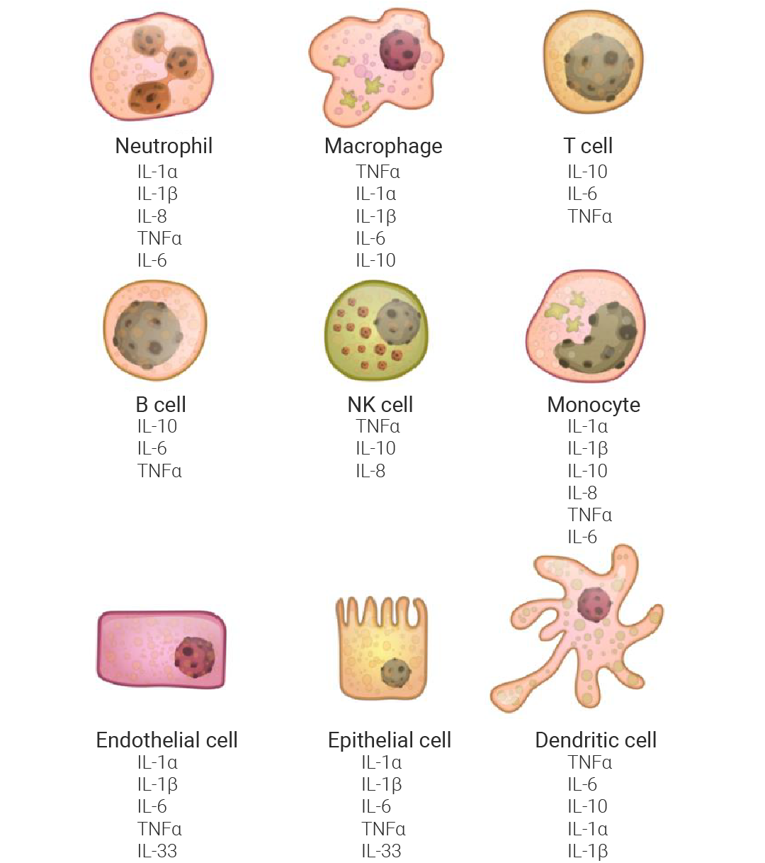 图 1. 表达不同细胞因子的各种细胞的示意图[1]。
