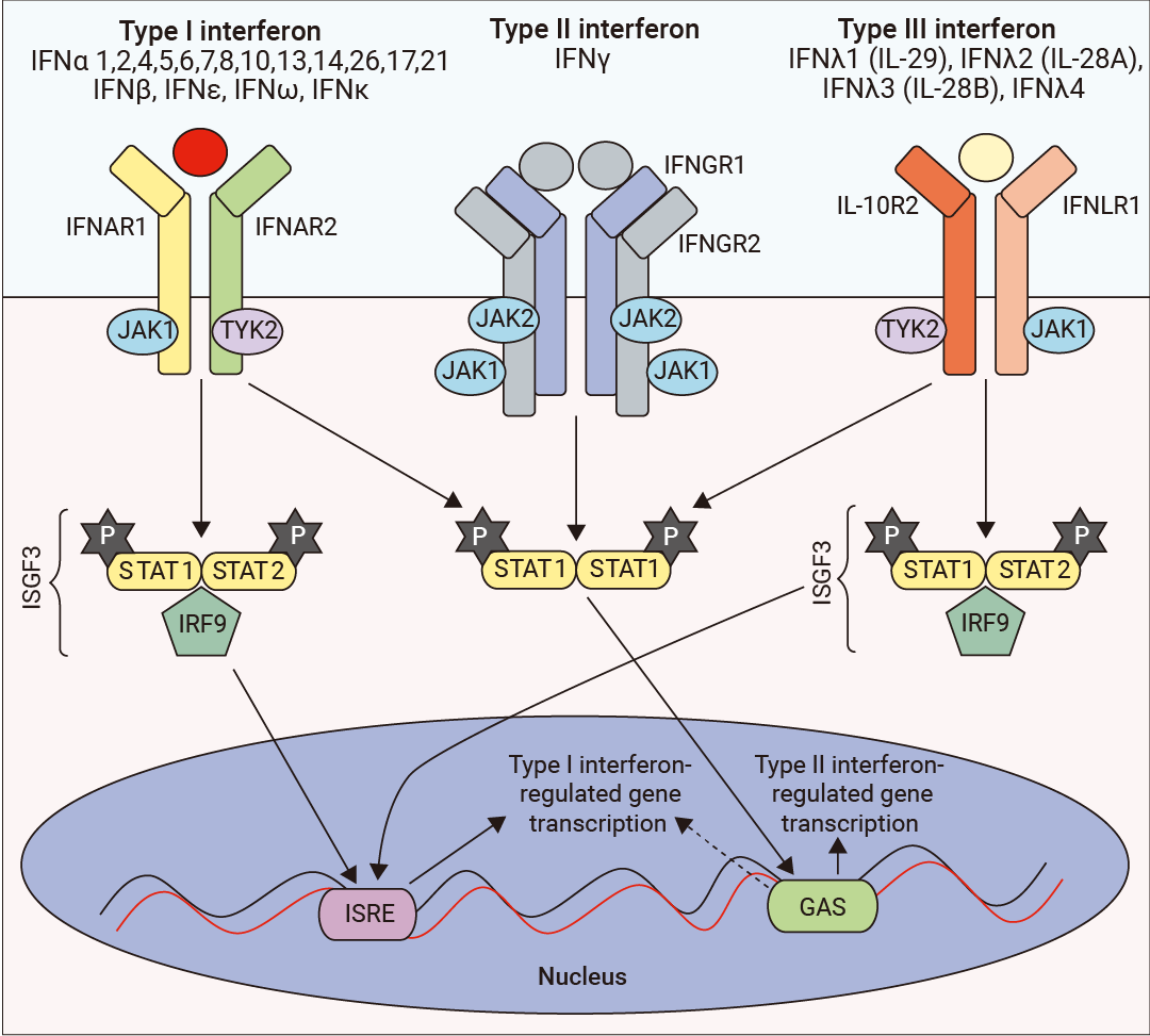 I 型干扰素有很多种,包括 IFN-α、IFN-β 和 IFN-ω,它们都与一种共同的细胞表面受体结合。IFN-γ 是唯一的 II 型干扰素,它通过与细胞表面一种独特的受体结合来启动信号传导。IFN 通过与特异性受体相结合,激活经典的 Janus 激活激酶 (JAK) – STAT 信号通路,对下游基因表达进行调控,从而发挥生物学效应[14][15]。