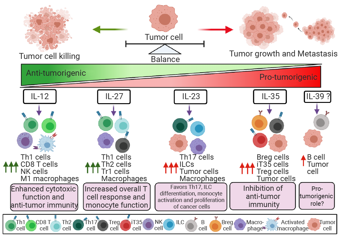 图 3. IL - 12 家族细胞因子在维持肿瘤发生过程中效应免疫反应与调节免疫反应平衡方面的作用[3]。