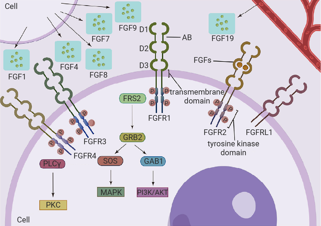 成纤维细胞生长因子受体 (FGFR) 是一类具有高度保守性的跨膜酪氨酸激酶受体,能够特异性地与成纤维细胞生长因子 (FGF) 蛋白家族的不同配体相结合。在脊椎动物中,已鉴定出五种不同的膜 FGFR,它们均隶属于酪氨酸激酶超家族 (FGFR1、FGFR2、FGFR3、FGFR4、FGFR5)[9]。其中部分受体与病理状况存在关联,例如 FGFR3 中的点突变可经由组成型激活受体,进而引发软骨发育不全。