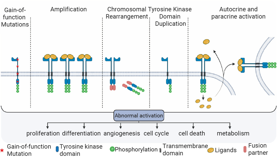 在癌细胞中,RTKs 的失调主要由功能获得性突变、过表达与基因组扩增、染色体重排、激酶结构域重复以及自分泌/旁分泌激活这五种机制介导[3][10]。这些机制会致使 RTKs 发生持续性磷酸化,进而过度激活下游的致癌信号通路,打破细胞生长与死亡的平衡,最终引发肿瘤转移、血管生成以及治疗耐药性。