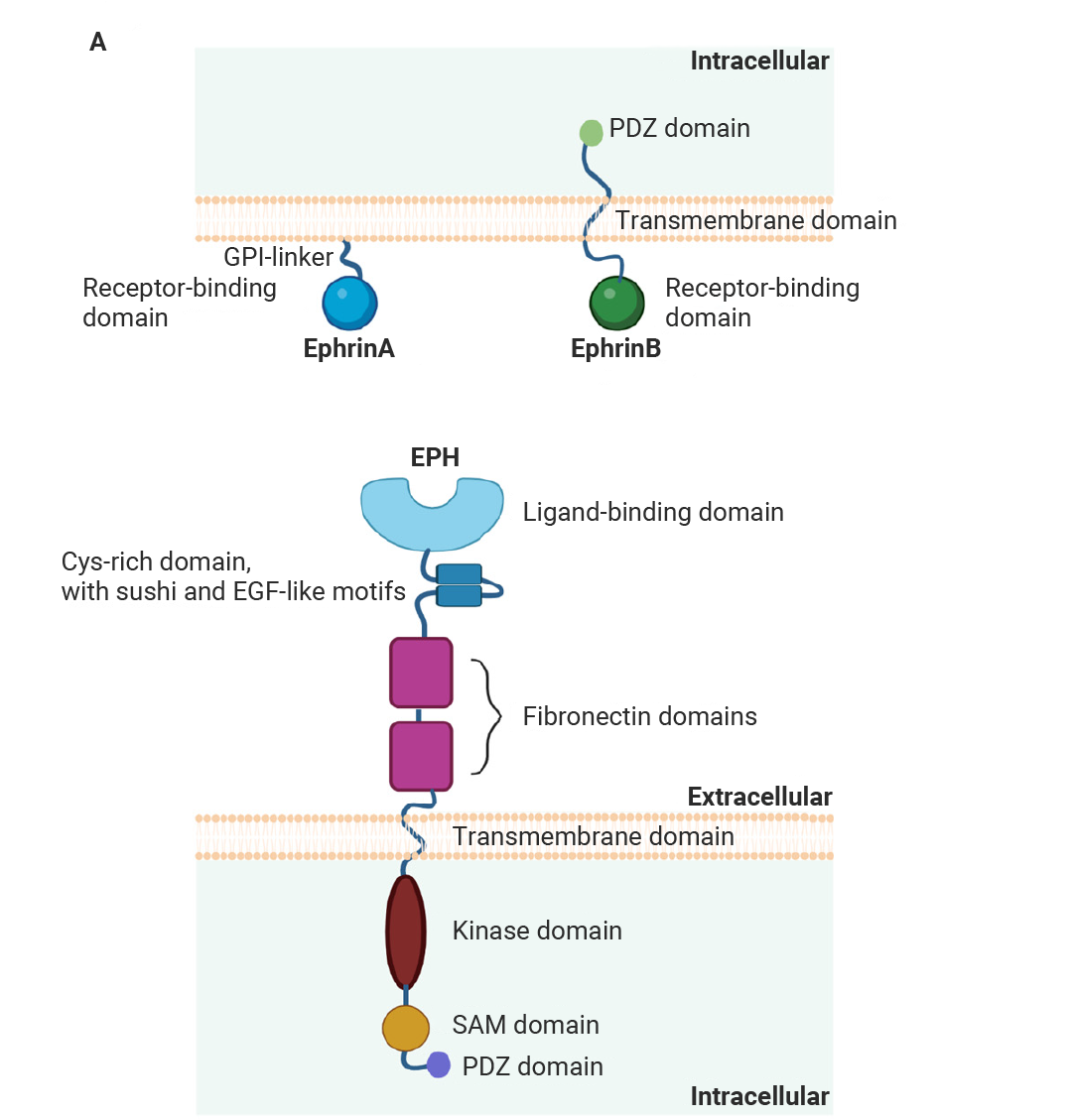 Eph 受体是目前已知的受体酪氨酸激酶 (RTKs) 中最大的家族,其配体为产生促红细胞生成素的肝癌受体相互作用蛋白 (Ephrins)[7]。在哺乳动物中,该家族已鉴定出 14 个成员。依据序列同源性、配体结合特性以及结构差异,它们被系统地划分为 EPHA (包含 EPHA1 - 8 及 EPHA10) 和 EPHB (包含 EPHB1 - 4 及 EPHB6)。