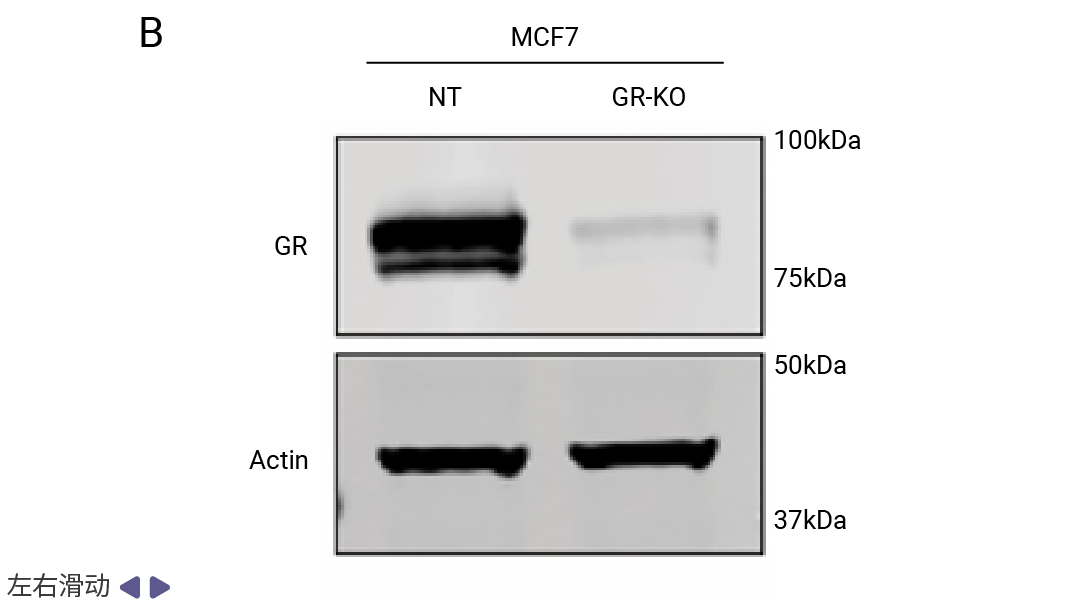 图 5. 非靶向对照 (NT) 或 GR 敲除 (GR-KO) MCF7 异种移植肿瘤在 6-8 周龄雌性无胸腺裸鼠中的生长 (A);NT (非靶向) 和 GR-KO MCF7 细胞中 GR 的蛋白质印迹 (B) [1]。