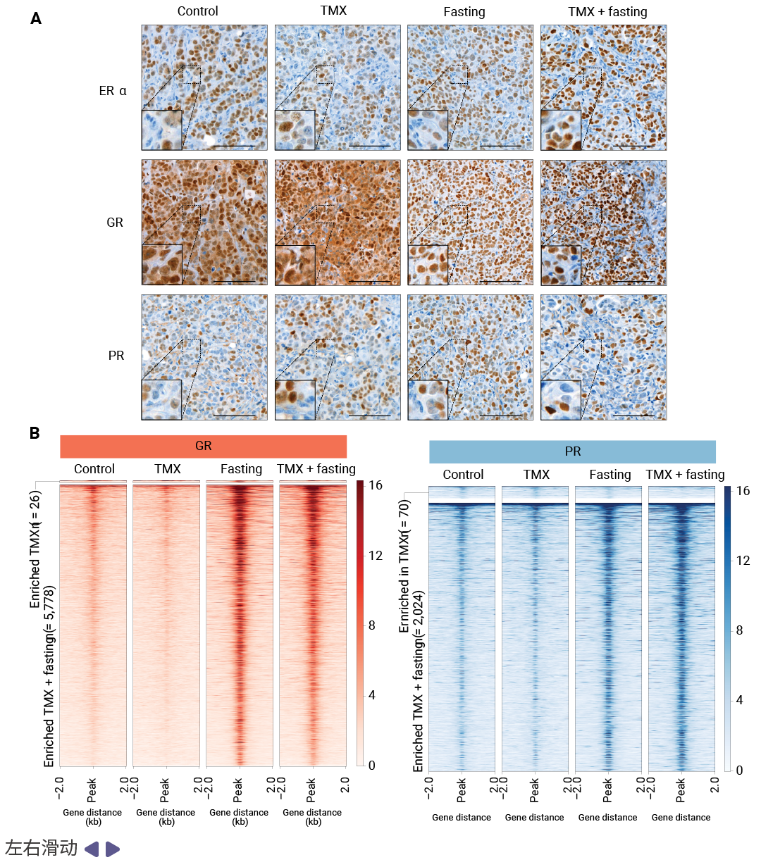 这一发现提示禁食可能通过"开关转换"机制调控肿瘤转录程序:一方面抑制促增殖的 AP-1 信号,另一方面激活具有肿瘤抑制功能的 SHRs 信号。免疫组化分析进一步证实,单独禁食或联合 TMX 均显著增加了 GR 的核定位,这是 GR 激活的典型标志,而 ERα 和 PR 的亚细胞定位则未受影响。ChIP-seq 实验直接证明了禁食诱导了 GR 和 PR 的染色质结合显著增强,而 JUN 在新获得的 H3K27ac 位点上并无 occupancy,说明禁食确实实现了从 AP-1 驱动到 GR/PR 驱动的转录程序转换。