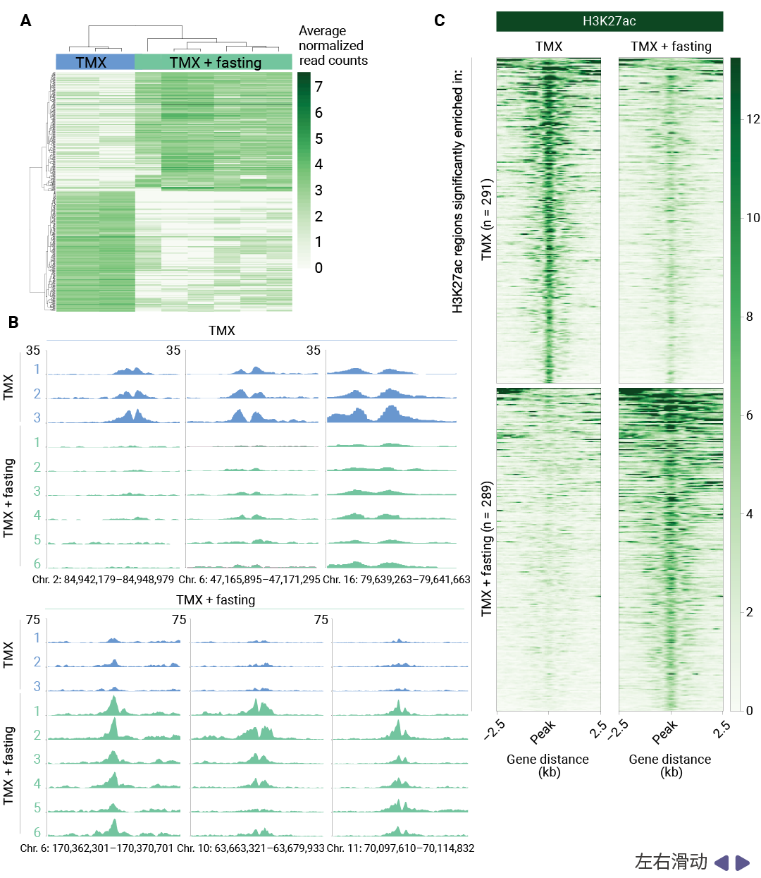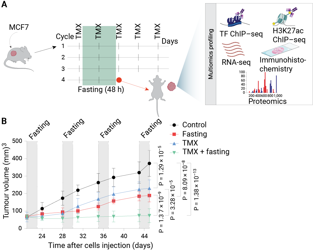 该研究的核心发现建立在系统的多组学分析基础之上。研究团队利用 MCF7 人源 HR+乳腺癌细胞系建立小鼠异种移植模型,采用每周 48 小时禁食联合 (Tamoxifen, TMX, 他莫昔芬是最常用的内分泌治疗药物之一) 的治疗方案,通过染色质免疫共沉淀测序 (ChIP-seq)、转录组测序 (RNA-seq)、蛋白质组学及免疫组织化学等技术,全面解析了禁食对肿瘤表观基因组和转录组的深刻影响。
