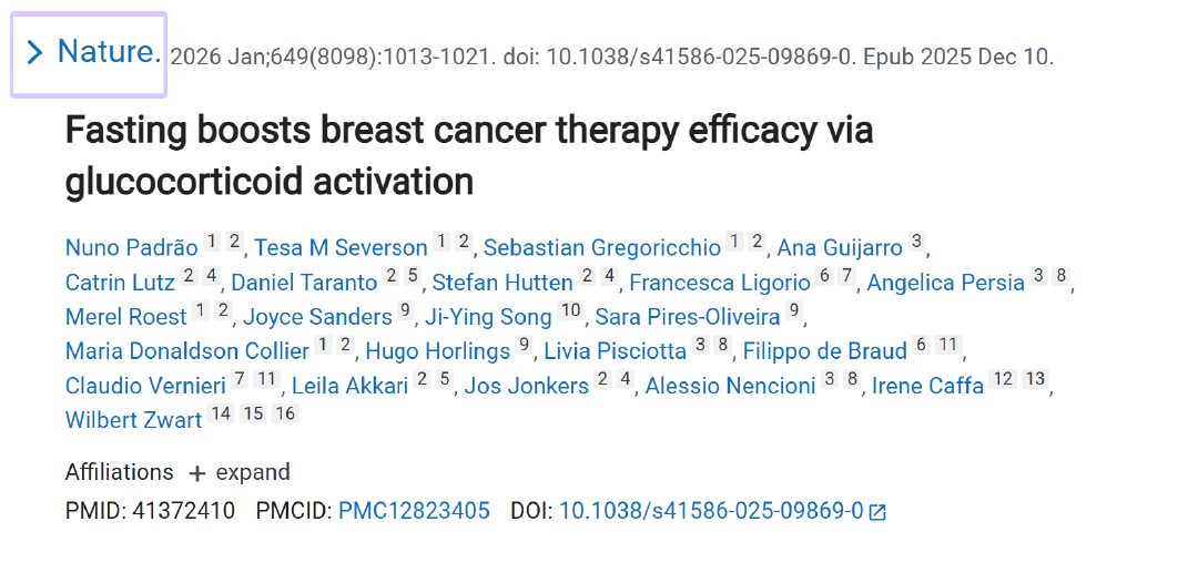 [1] Padr?o N, et al. Fasting boosts breast cancer therapy efficacy via glucocorticoid activation. Nature. 2026 Jan;649(8098):1013-1021.